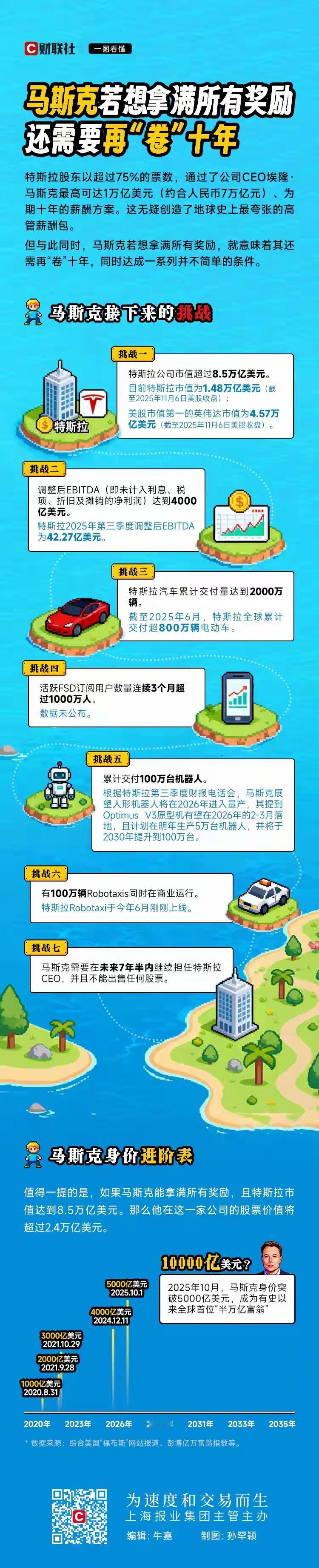 马斯克获得的万亿薪酬需要付出多大的代价? 每一个都非常的艰难,也只有马斯克才敢做这样的事,换成其他人想都不敢想,而且要在十年内完成… 第一件事就是要把特斯拉的市值涨到超过8.5万亿美元,现在特斯拉的市值是1.48万亿美元,也就是要翻上四倍多的市值, 第二个要将特斯拉调整后的EBITDA实现4000亿美元,这同样也难,要知道特斯拉今年第三季度的EBITDA是42.27亿美元,全年也不到200亿美元, 第三个要实现特斯拉的所有交付量突破2000万辆,现在离这个目标还差1200万辆! 第四个要成功实现特斯拉的FSD活跃用户超过1000万人,FSD也是特斯拉未来全面实现汽车自动驾驶的保障,只有用户基数庞大,特斯拉才能稳稳占据全球自动驾驶的宝座, 第五个要让特斯拉成功交付100万台机器人,如今特斯拉的机器人发展如火如荼,但是还没开始量产,预计量产的时间要在2026年,而且计划四年时间,在2030年把特斯拉机器人的产能拉升到100万台, 第六个是要实现特斯拉100万辆无人驾驶汽车投入使用,而现在特斯拉的rebotaxi才刚刚开始投入使用,还是起步阶段, 第七个对马斯克来说比较简单,就是后面的七年半时间内,马斯克要一直担任特斯拉的CEO,而且不能再出售特斯拉的任何股票。 七个条件下来,感觉马斯克不是在搞企业,像是在改造人类的未来生活方式,而且马斯克觉得其他芯片企业造芯片太慢,要自己打造一座能够满足特斯拉芯片产能的超级工厂…从芯片、汽车、机器人、无人驾驶、脑接机、星链、火箭回收等等,马斯克一直在玩最牛逼的东西,实在佩服
