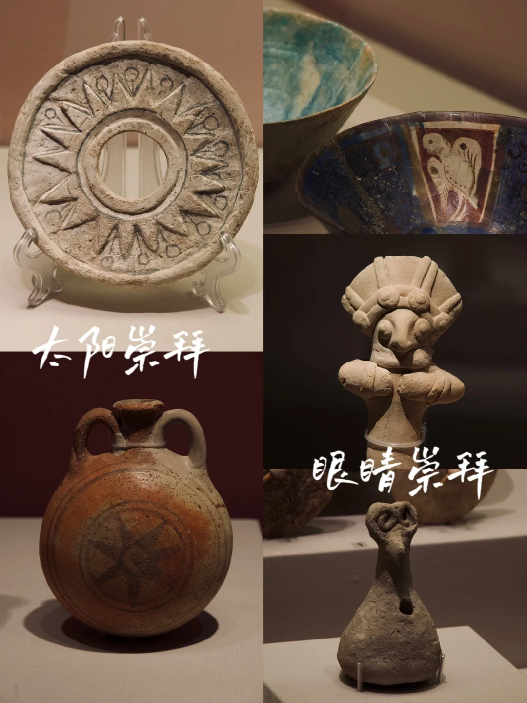 成都金沙有“太阳神鸟”,展览有一件距今约3000多年的彩陶壶,壶身上也有太阳纹饰。