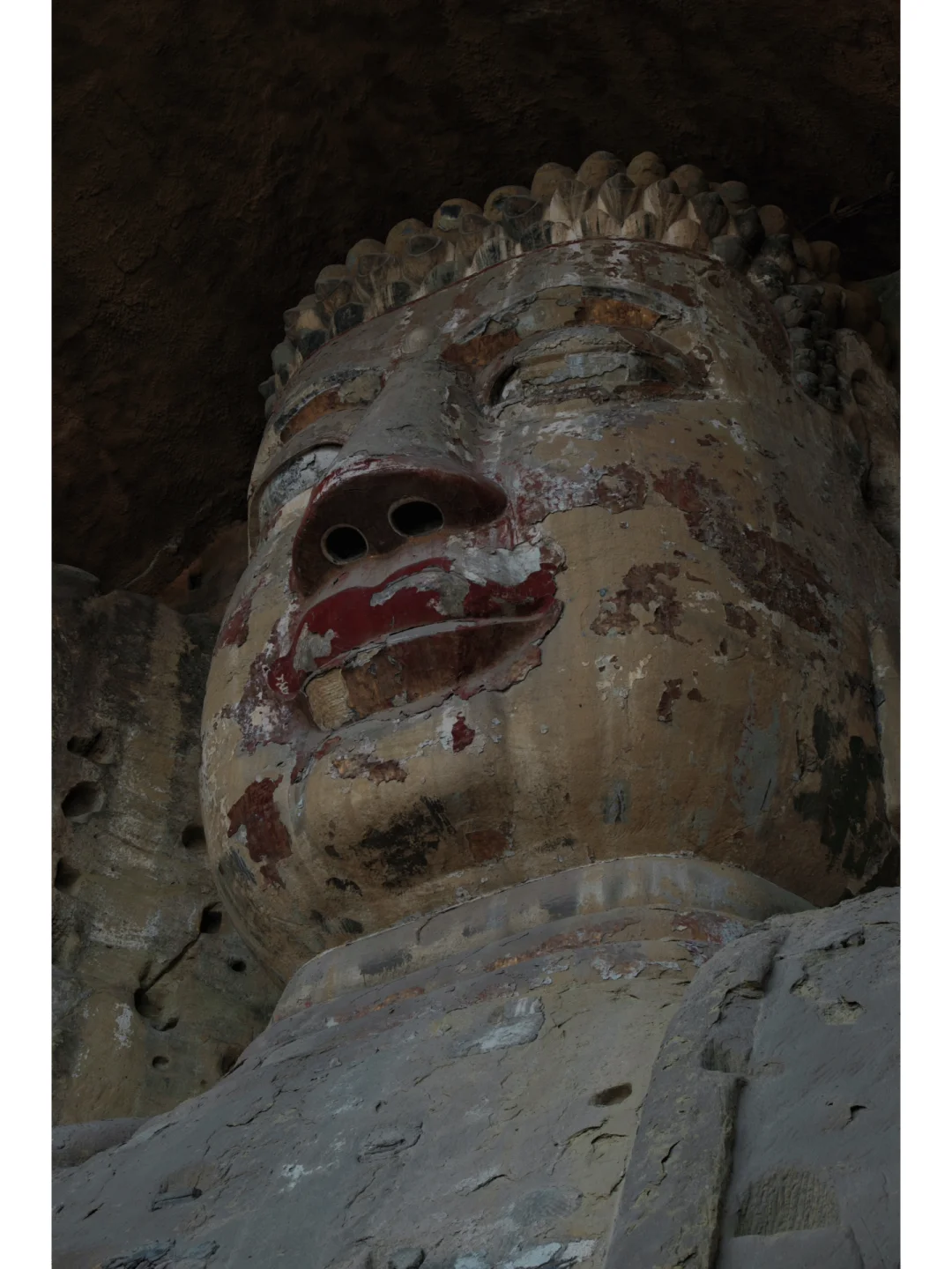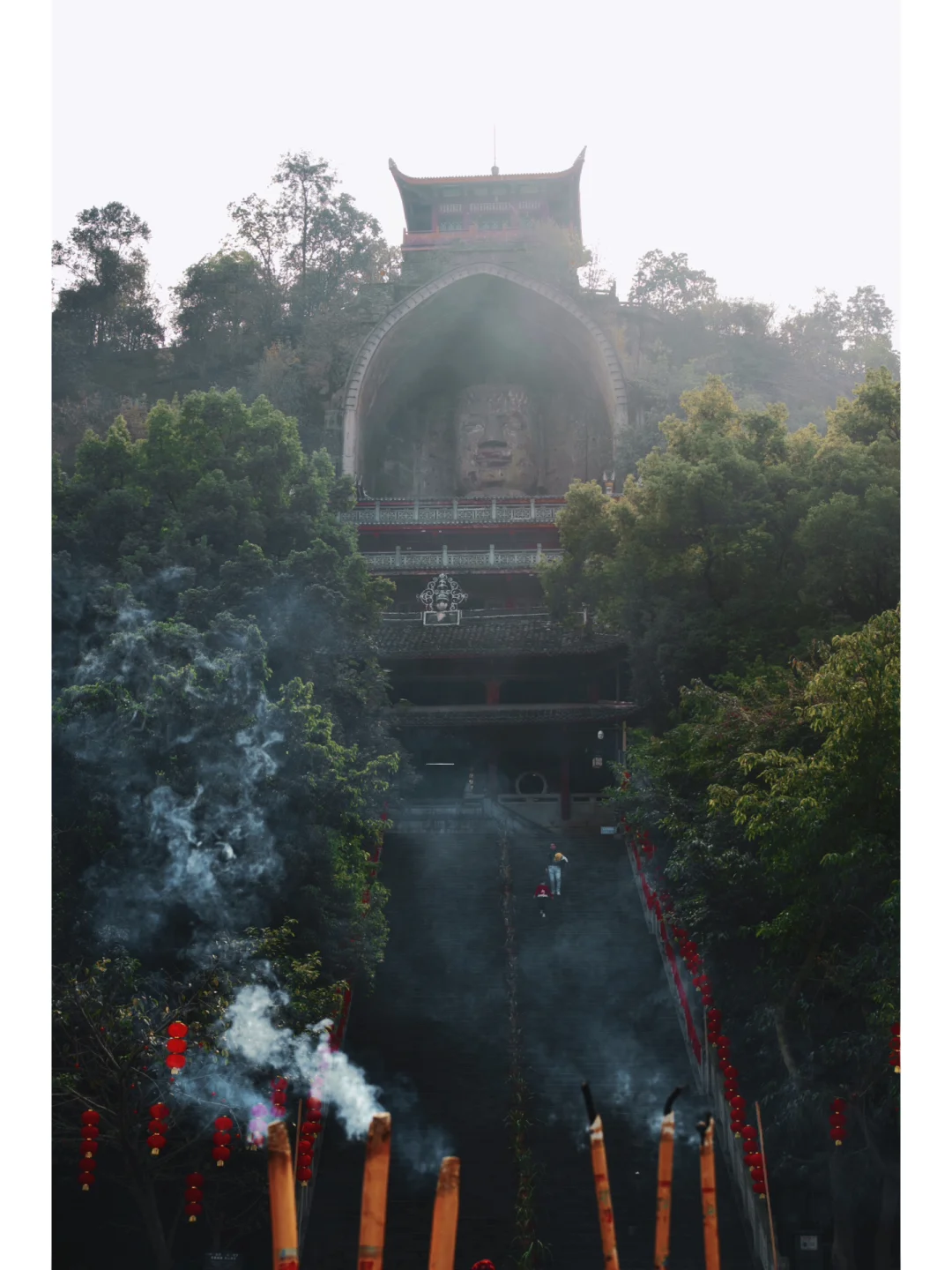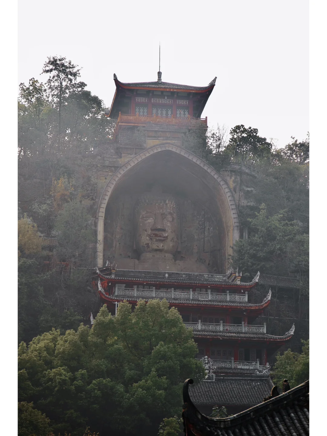 大佛依山而凿,宽衣博袖,雕饰细腻,面部丰满,大佛右手抚膝,左手托珠,神情肃穆威严而又显宽宏慈悲。🪷