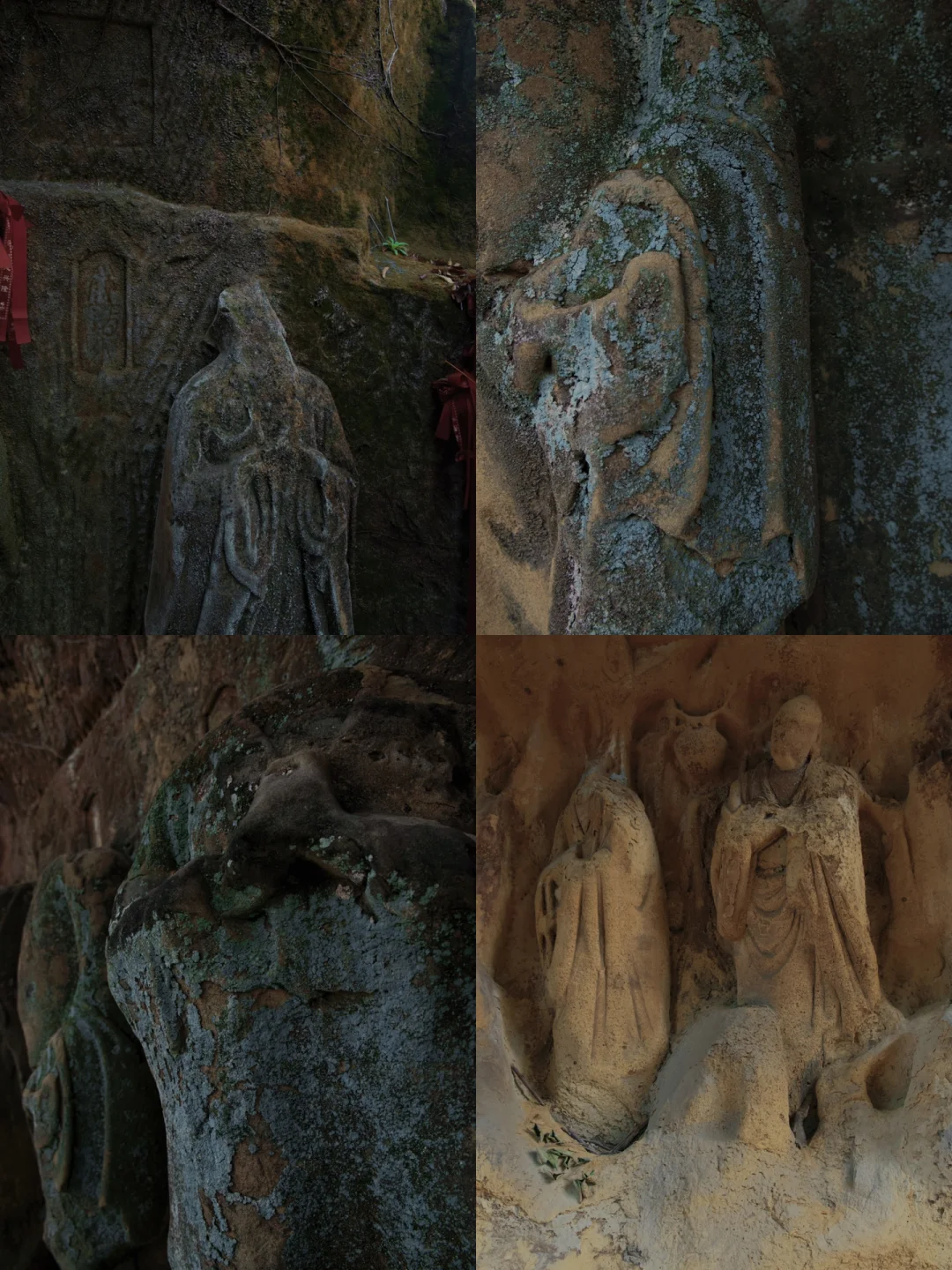 进门处两边是荣县博物馆,登上山顶,可以俯瞰荣县县城,山上还有一处放翁亭,相传陆游📝曾在此(古荣州)做知州,常登大佛,在此吟诗。下山左边是一处荣州碑园,陈列着荣县的历代名碑,大佛两边是啸台,啸台崖壁还有唐宋摩崖造像,很多头部已经缺失,身体风华严重,但依然能看出唐宋的雍容典雅,超脱凡尘。
