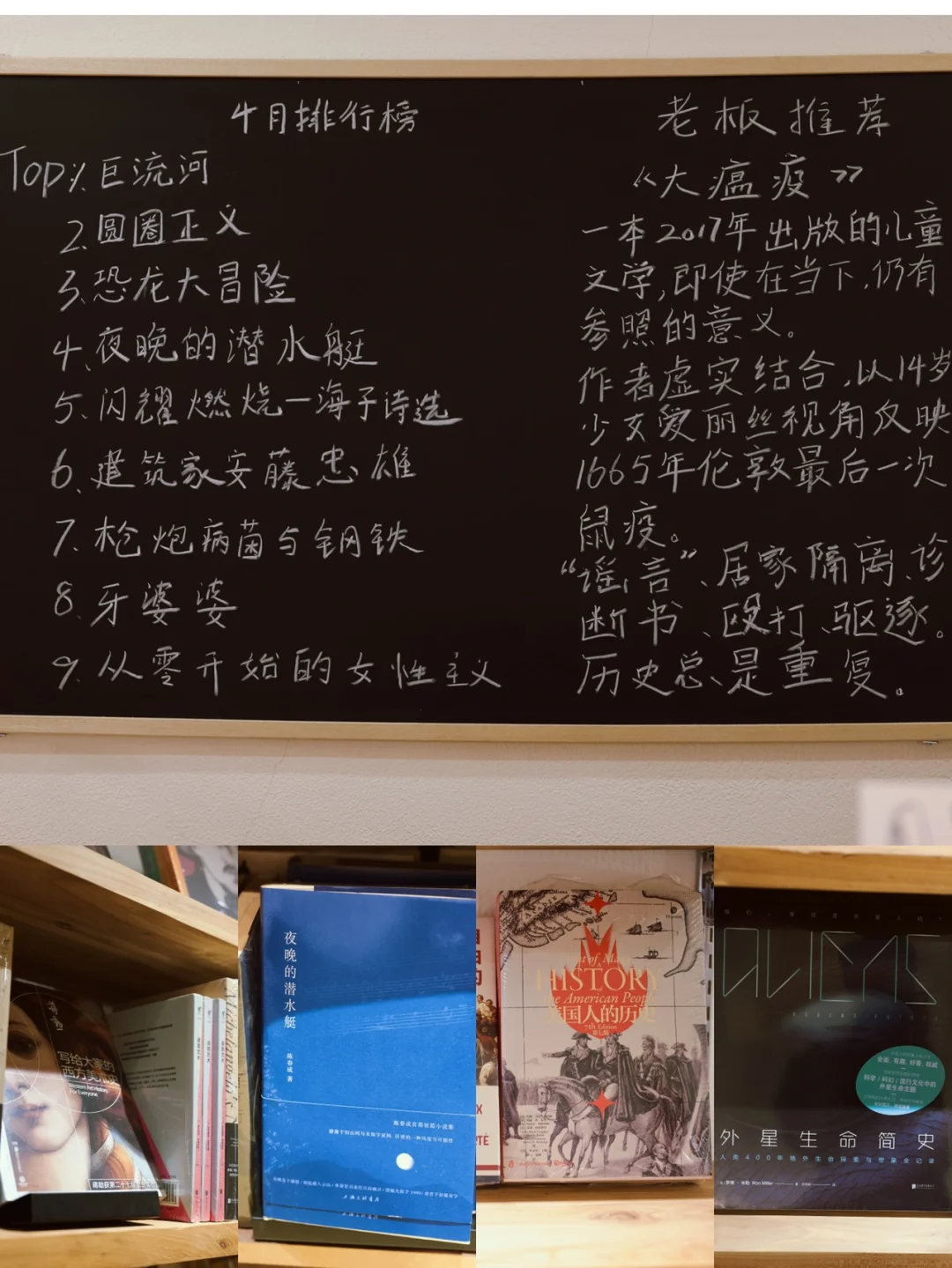 3、经管、社科、艺术、历史等等书店也有,主要位于1楼左侧和2楼右侧书架。我在书店发现了洋仔也是莫西子诗的歌迷,2楼的书架上有一张莫西《月亮白的很》专辑💿的TO签,他也把专辑里面的海报和纸卡放在书店几个角落。店里还有一台💽黑胶唱机,是洋仔朋友送给他的,他看我比较感兴趣,便拿出了他的珍藏——“美版旅行者1号金唱片”进行播放,之前对其也是略知一二,洋仔给我详细讲解了“旅行者1号”🛰的相关故事。临走时,发现了书店还有《无尽之河:平克弗洛伊德传》🎸,遂拿下。