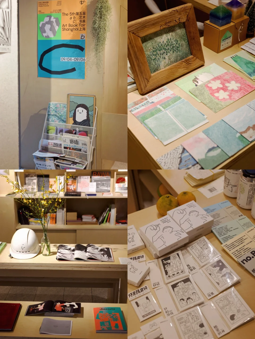 书店里面的书都是可以拆封,“不拆开咋知道咋样,但请勿暴力”,这样的手写温馨提示,让人倍感温暖。在书店橱窗🪟区域,目前是abC书展的回忆角,奶油告诉我,书展这种限定时间🕐的展览,展览结束以后希望能更多的人所看到,再次被认识,所以这里陈列了1-7届abC艺术📓书展的展册、周边、海报等等。