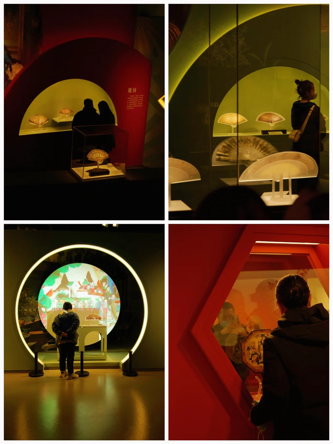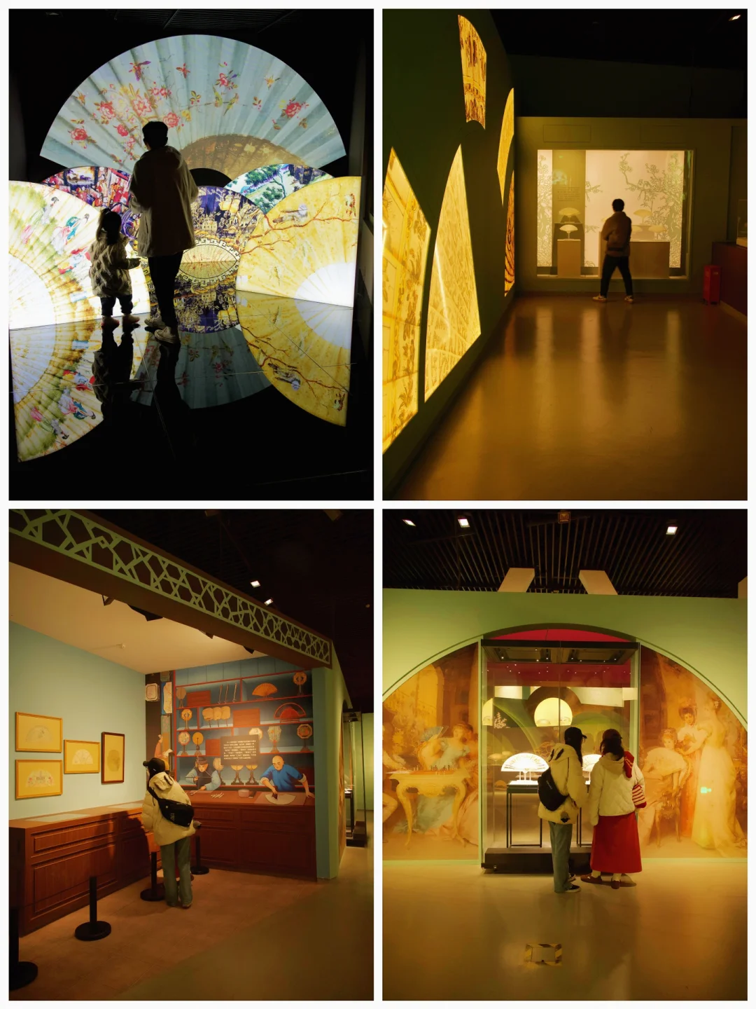 🪶中国风尚:主要展示外销扇对西方文化的一些影响,因为外销扇成为东西方艺术文化交流的一条纽带,欧美国家也开始流行“中国风”,以庭院风光、吉祥花鸟、彩绘动物等饱含浓郁“中国风”特色的元素作为扇面装饰,成了中国传统文化走向世界的一面旗帜。