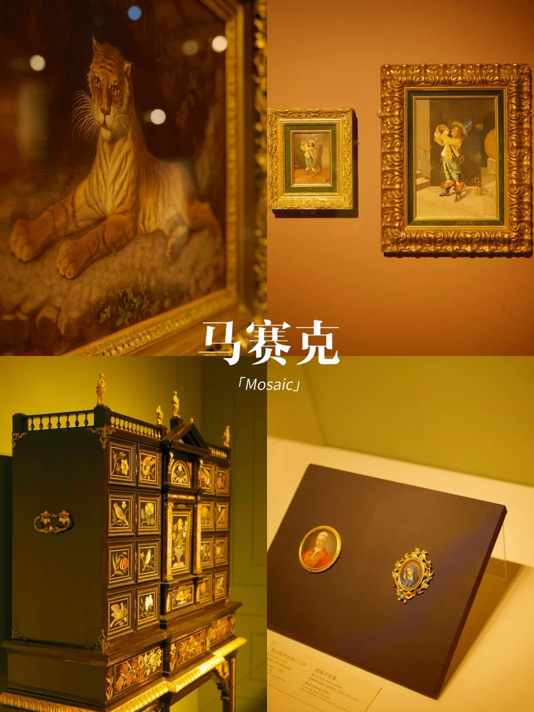 展厅里面个人这次最喜欢的还是🏁马赛克板画,这种古老的镶嵌艺术,通过贝壳,瓷砖,玻璃片等有色嵌片,有些需要用成千上万的嵌片,一个一个的镶嵌成一副画,真的需要极大的静思和耐心,展厅里的花鸟图案柜上面的鸟🐦真的非常好看,配色高级,而雌虎🐅那幅画做的栩栩如生,色彩过渡很自然。
