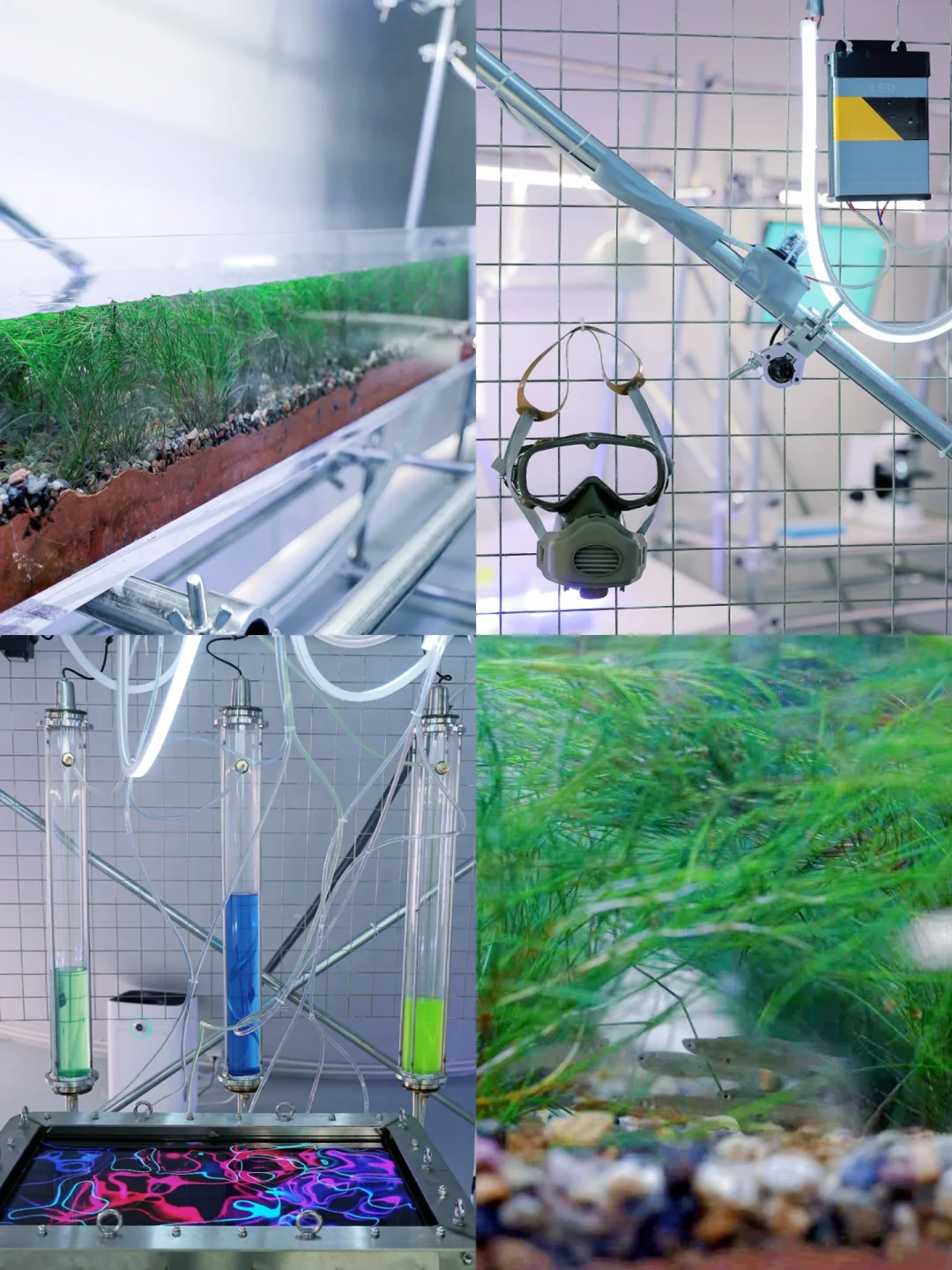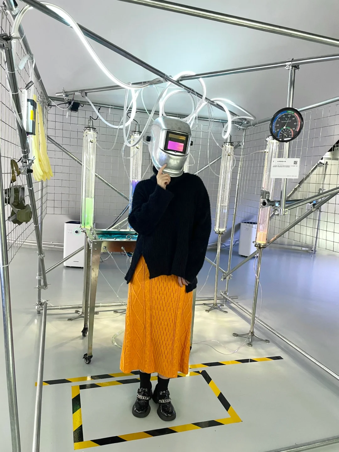 4️⃣“未来智能水体”可以带上头盔🪖(图2),装置内的水会有变化,它模拟了一个和人体类似,具有激素调节机能和内分泌循环的机械生命。