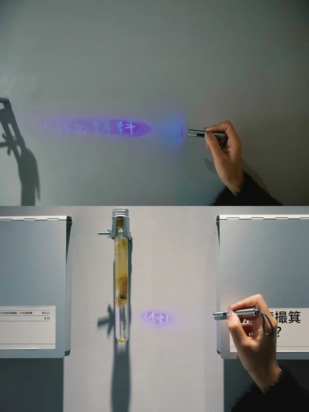 1️⃣进门可以前台拿上🟣紫光灯,把紫光灯切换到紫光模式,用灯照在展厅的墙上(图6),可以发现很多彩蛋,主要集中在“意想不到的破坏”和“寻找内驱力”。