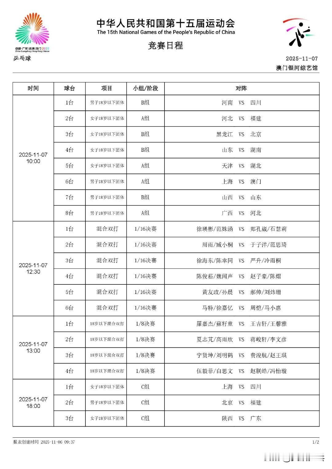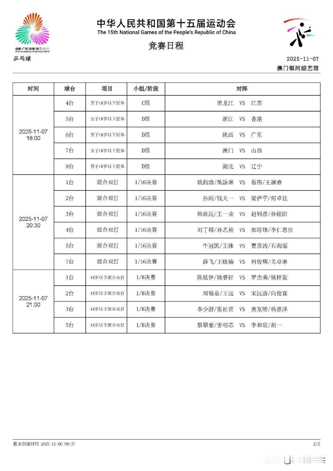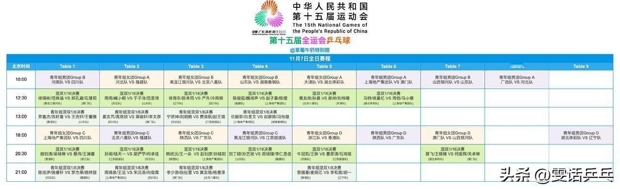 第十五届全国运动会·乒乓球项目 青年组 混双1/8决赛:11.7 21:00场 共4场赛果 1.李和宸/胡一(辽宁队)3-0黎骐豪/麦明芯(香港队)【11-8,11-9,11-3】 2.罗杰乘/姚梓旋(福建队)3-2陈炫伊/姚睿轩(河北队)【11-6,11-7,13-15,7-11,11-7】 3.周锦泉/王远(上海地产集团队)3-1宋沅洛/向俊霖(四川队)【13-11,11-8,11-13,11-4】 4.黄友皓/杨惠泽(北京八喜队)3-0李少游/张祉萱(澳门队)【11-8,11-3,11-4】