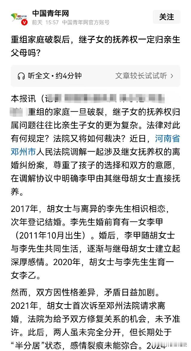 河南邓州,胡女士和二婚带娃的李先生再婚,婚后没几年,两人感情破裂离婚,可李先生的女儿却不愿意跟亲生父亲,反而要求跟着胡女士这个继母一起生活,那么,法院会怎么判呢? 据中国青年网报道,李先生曾经有过一段婚姻,和前妻还生了一个女儿,可没多久,两人就感情破裂离婚了,女儿跟李先生生活。 2017年,胡女士认识了李先生,两人建立了恋爱关系,2018年,两人登记结婚。 古话说后妈难当,可这句话在胡女士这里却失效了。 胡女士认识李先生的时候,李先生的女儿小李刚刚6岁,小姑娘每天跟在胡女士屁股后面跑,一口一个阿姨叫的亲热,两人结婚后,小李没有任何压力,又改口叫她妈。 胡女士对这个可爱软萌的小姑娘也非常喜爱,把她当做自己亲生的孩子养,母女两个的感情非常深厚。 结婚两年后,胡女士生育了自己的孩子,可亲生女儿出生后,胡女士对小李的疼爱并没有减少半分,小李和妹妹也建立起了深厚的感情。 然而孩子刚出生一年,胡女士和李先生就矛盾越来越深,胡女士直接起诉离婚了,但是院方认为,两个人感情还有修复的可能,没有准许二人离婚。 两人回家后,虽然一时半会没有再闹离婚,但两人长期处于半分居状态,感情也没能得到修复。 2024年,胡女士再次起诉离婚,这次两人成功离婚,小李和胡女士的亲生女儿都归胡女士抚养,两人婚内买的房子也归胡女士所有。 离婚后,两个孩子一直闷闷不乐,李先生又多次求和,胡女士为了让孩子有个健康成长的环境,决定给李先生一个机会,两人复婚了。 可复婚后,两人之间的矛盾再次爆发,胡女士终于意识到,她和李先生之间的矛盾根本无法解决,于是再次起诉离婚。 可复婚容易离婚难,李先生不愿意将小李的抚养权给胡女士,胡女士舍不得养了8年的大女儿小李,小李也哭着闹着要和胡女士及妹妹在一起。 胡女士和小李没有血缘关系,她和李先生离婚,能否要到继女的抚养权? 夫妻离婚时,孩子的抚养权到底归谁,要综合多方面因素,以最利于孩子成长为基础原则。 《民法典》第一千零八十四条规定,离婚后,不满两周岁的子女,以由母亲直接抚养为原则。已满两周岁的子女,父母双方对抚养问题协议不成的,由人民法院根据双方的具体情况,按照最有利于未成年子女的原则判决。子女已满八周岁的,应当尊重其真实意愿。 一般情况下,不满两周岁的子女,以由母亲直接抚养为原则。这是因为两周岁以下的子女通常更需要母亲的照顾和呵护,母亲在生理和心理上更能满足婴儿的需求。 但如果母亲存在患有久治不愈的传染性疾病或者其他严重疾病,子女不宜与其共同生活。 或者母亲有抚养条件不尽抚养义务,而父亲要求子女随其生活等情形的,父亲也可以获得抚养权。 对于已满两周岁的子女,父母双方对抚养问题协议不成的,由人民法院根据双方的具体情况,按照最有利于未成年子女的原则判决。 这种情况下,会综合考虑双方的经济状况、生活环境、教育背景、道德品质等因素。 如果一方有稳定的收入和良好的居住条件,能够为子女提供更好的生活和教育资源,一方有不良嗜好或者存在违法犯罪记录,可能会对子女的成长产生不利影响,这些都会成为法院判决抚养权归属的参考因素。 对于已满八周岁的子女,应当尊重其真实意愿。这是为了尊重未成年人自主意识和选择权。 胡女士是否可以取得小李的抚养权,要从形成抚养教育关系的继父母子女关系来考虑。 《民法典》第一千零七十二条规定,继父母与继子女间,不得虐待或者歧视。继父或者继母和受其抚养教育的继子女间的权利义务关系,适用本法关于父母子女关系的规定。 自胡女士认识李先生后,胡女士一直将小李当作亲生女儿抚养,在长达8年的时间里,给予了小李生活上的照料、情感上的关怀和教育上的支持,双方形成了事实上的抚养教育关系。 这种关系一旦形成,就具有了与亲生父母子女关系同等的法律地位。 胡女士和李先生离婚时,小李已经超过八周岁,她明确表示要和胡女士及妹妹在一起,表达了强烈希望跟随胡女士生活的意愿。 从最有利于未成年子女的角度来看,胡女士与小李长期共同生活,彼此感情深厚,已经建立起了稳定的家庭关系。而且,小李和妹妹也建立了深厚感情。 如果强行将小李与胡女士分开,可能会对小李的心理和情感造成极大的伤害,不利于她的健康成长。 相反,继续由胡女士抚养小李,能够为小李提供一个熟悉、稳定且充满爱的成长环境,更符合最有利于未成年子女的原则。 因此,虽然小李不是胡女士亲生的,但是二人形成了事实上的继母女关系,胡女士和李先生离婚时,在双方都愿意的情况下,胡女士可以获取小李的抚养权。 最终,经过调解,胡女士和李先生离婚,小李及妹妹由胡女士抚养,李先生享有探视权。