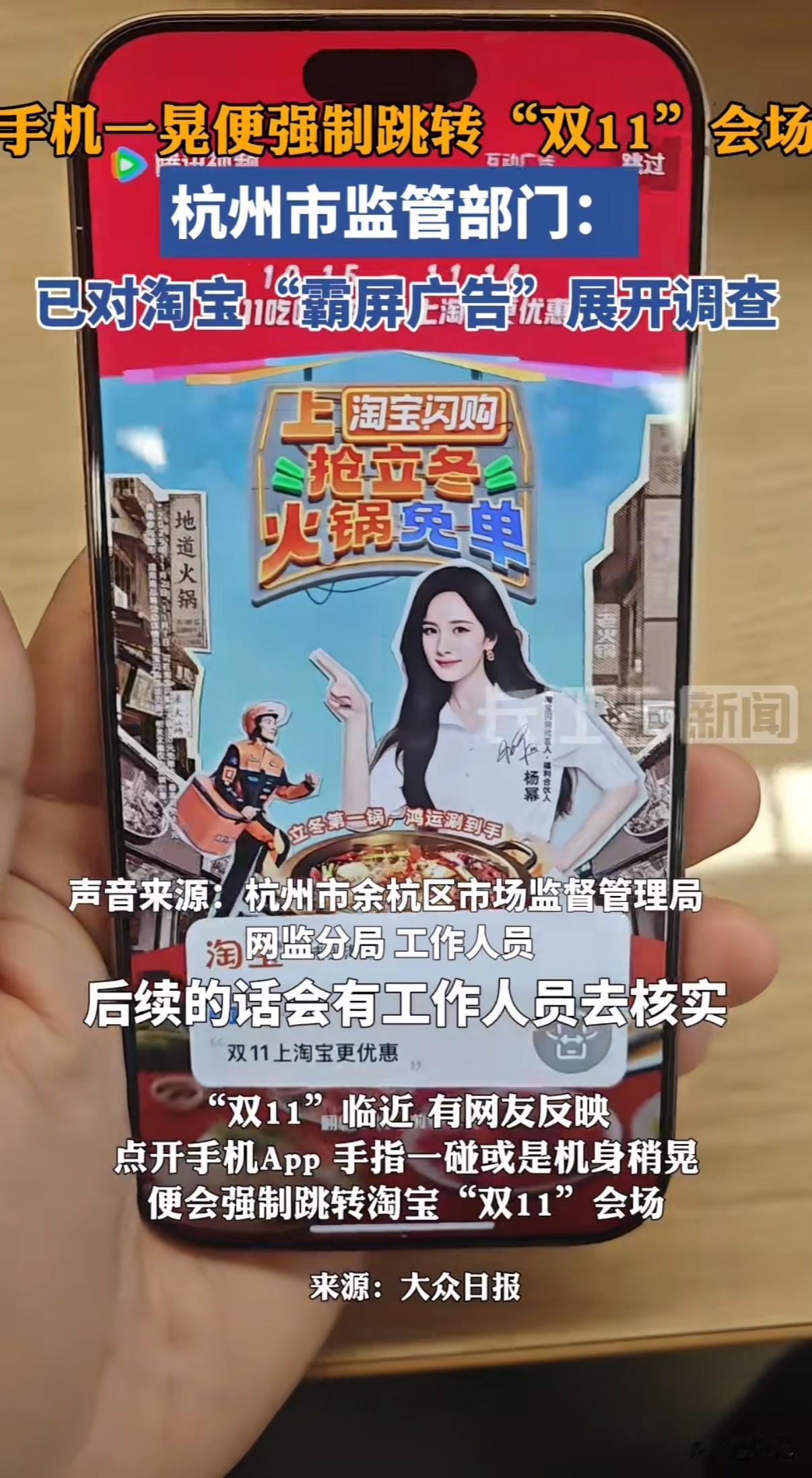 打开手机百度,优酷等,轻轻一晃就跳转淘宝双11。 闲鱼、菜鸟也一样,手指一碰就跳走。 关都关不掉,按钮要么隐蔽要么失灵。 网友调侃:“条条大路通淘宝”。 杭州市场监管已介入调查。 淘宝曾因广告违法两次被罚。 这次霸屏广告背后,是平台的流量焦虑。 有专家点破:淘宝需要流量,其他APP需要广告收入。 只有用户被困在跳转里。 现在大家都在等调查结果。