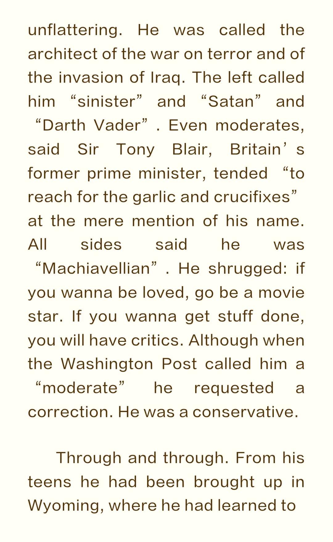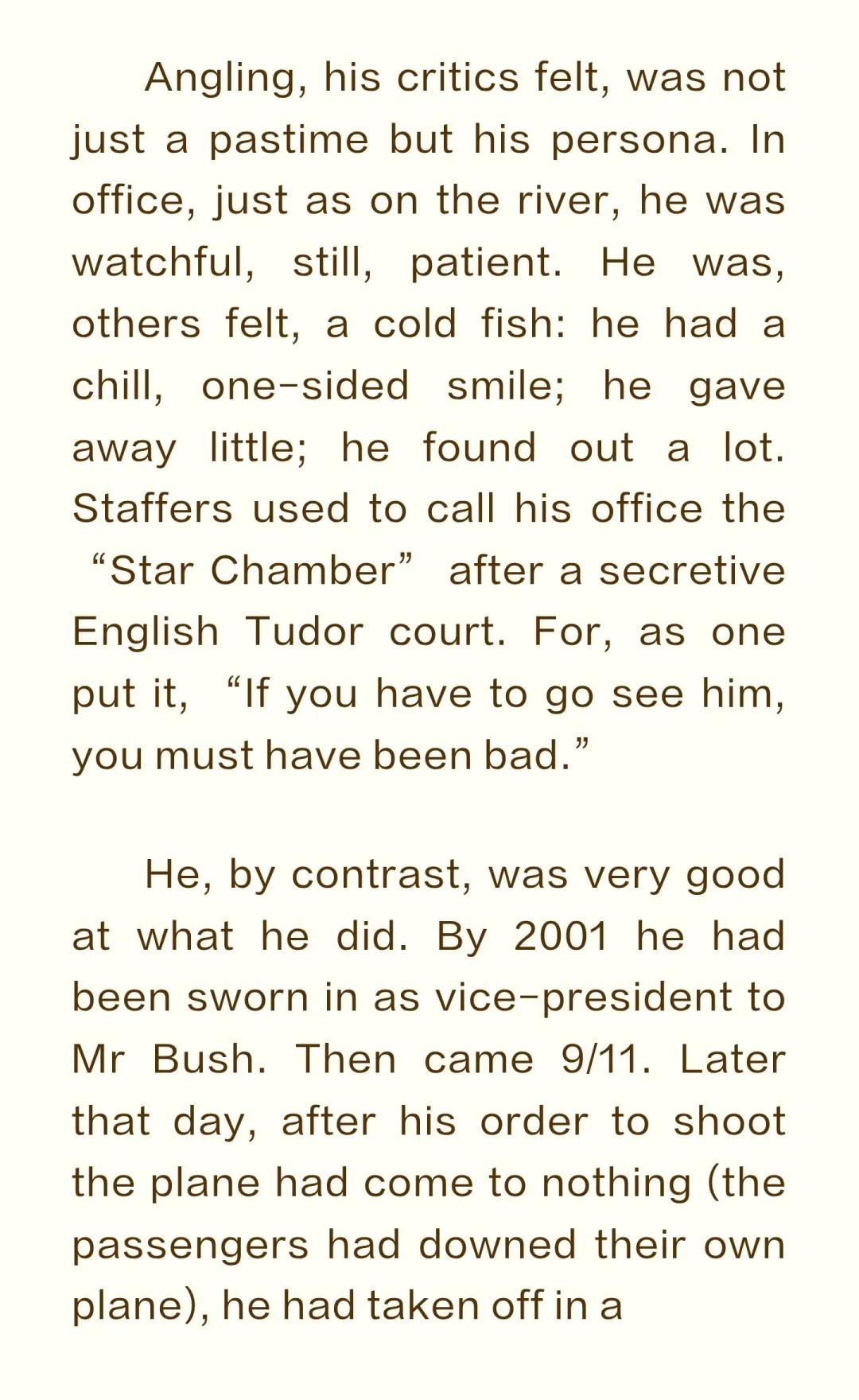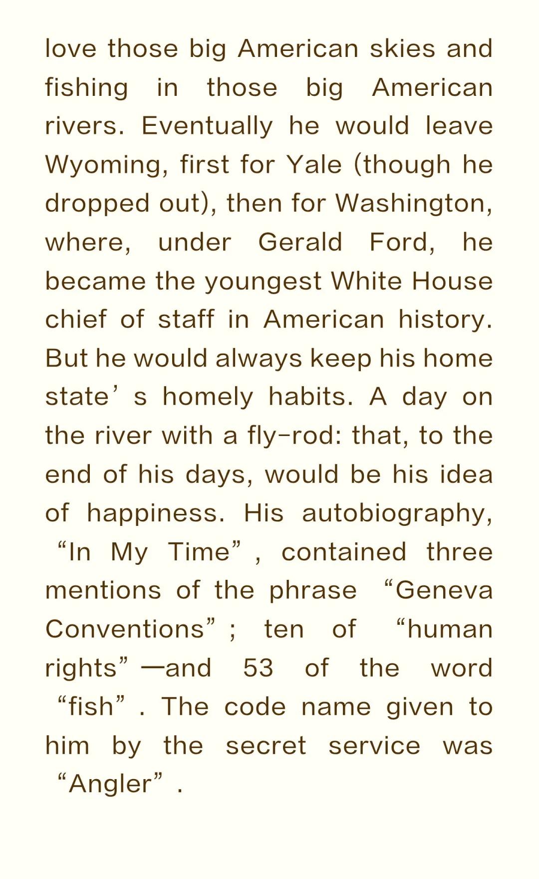 经济学人讣告:Dick Cheney 又是一篇写得极好的讣告 以Dick Cheney的高光时刻开头,引出了他的副总统生涯,解释了为何他被称为“美国历史上最具权利的副总统”,穿插了他的生平和爱好,更写出了他的mindset:“He was, as always, just doing his job. Trying to protect America. ” 经济学人