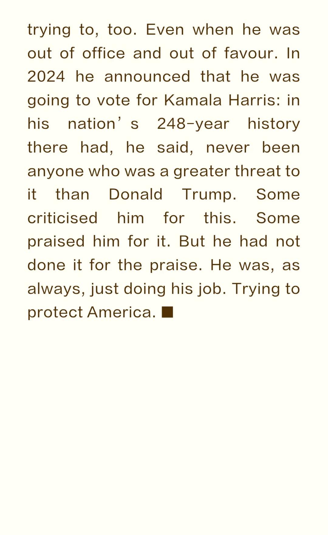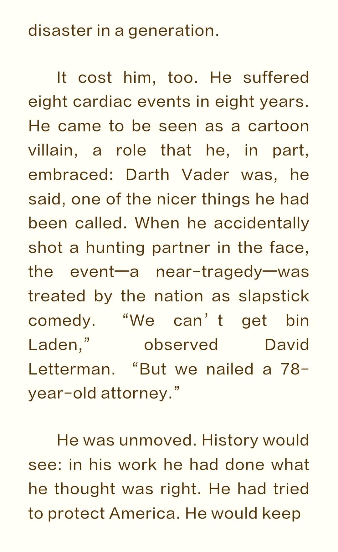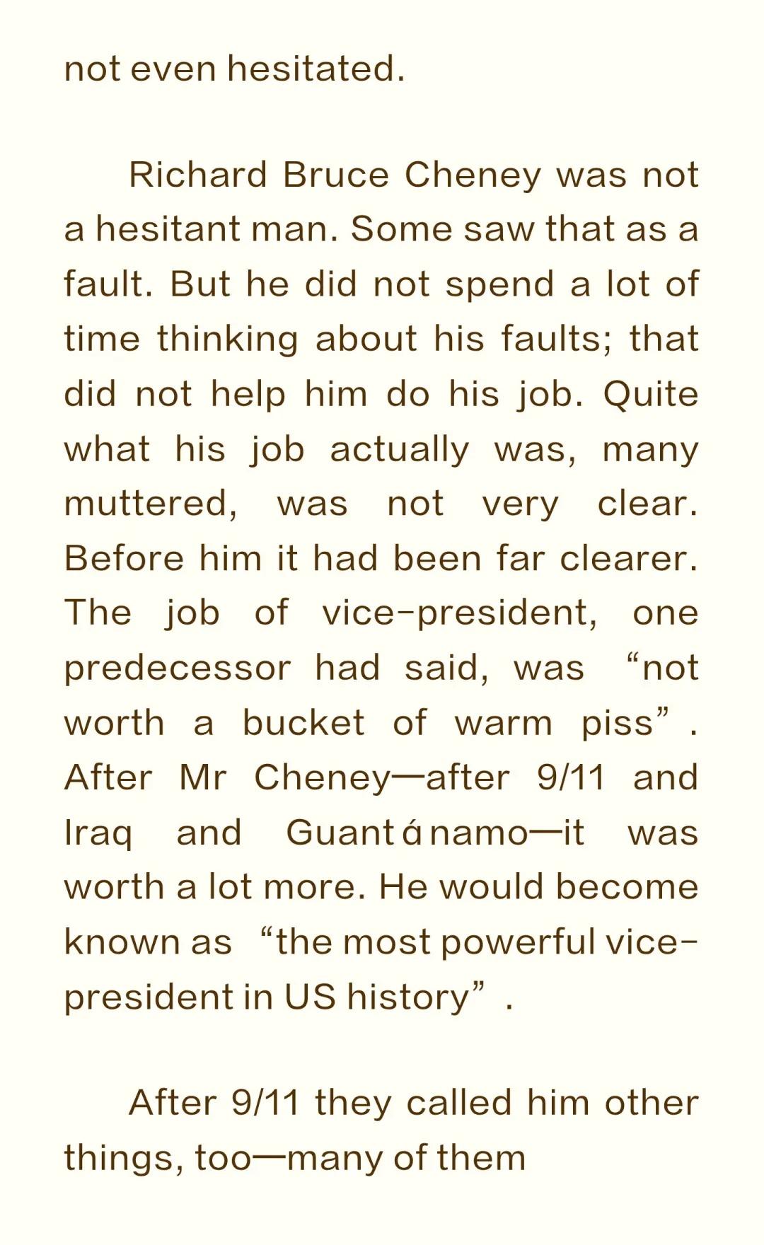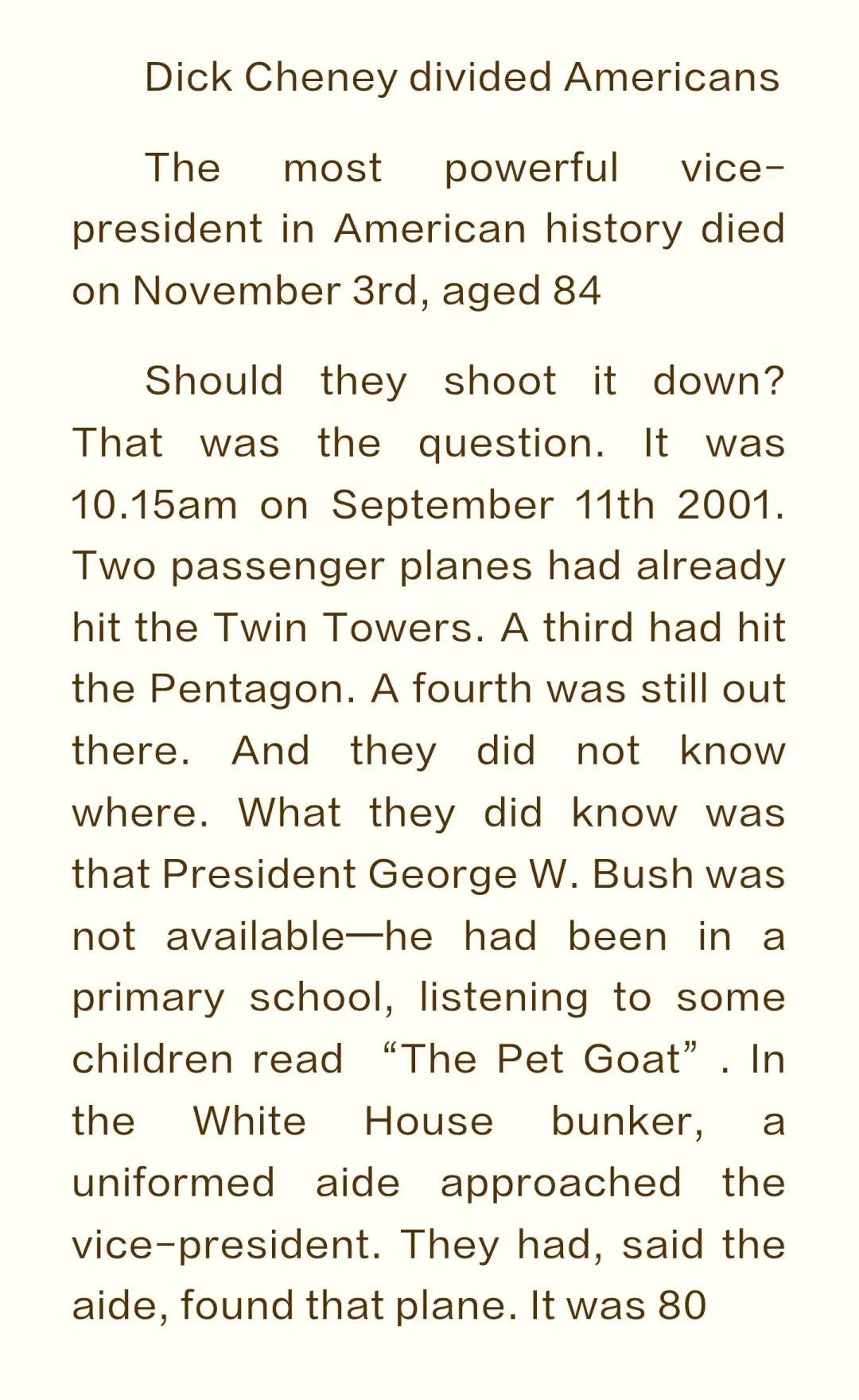 经济学人讣告:Dick Cheney 又是一篇写得极好的讣告 以Dick Cheney的高光时刻开头,引出了他的副总统生涯,解释了为何他被称为“美国历史上最具权利的副总统”,穿插了他的生平和爱好,更写出了他的mindset:“He was, as always, just doing his job. Trying to protect America. ” 经济学人