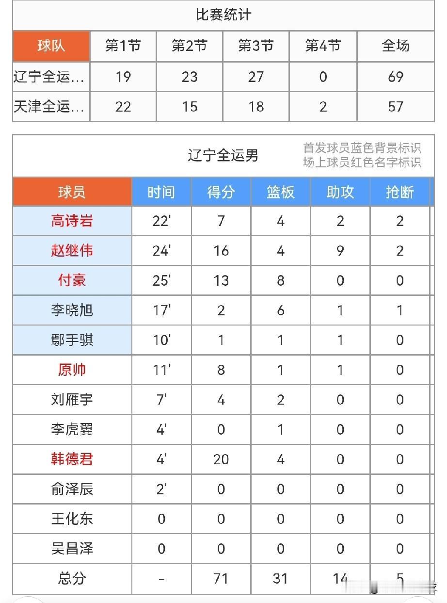 全运会麦迪时刻!韩德君4分钟砍下20分 全运会辽宁队以91-59大胜天津队,辽宁队老将韩德君再度爆发,全场打了11分钟,11投8中爆砍21分4篮板。 然而更加恐怖的是,他出场4分钟的时候,就10投8中砍下了20分4篮板,这效率堪比麦迪了吧,古有麦迪35秒13分,今有韩德君4分钟20分,确实牛逼。 韩德君今年38岁了,还能打出如此高的效率,似乎在向大家证明,我油箱里还有油,如果新赛季辽宁队战绩不佳,或者内线轮换不够,韩德君突然复出,请大家不要感觉意外,韩德君的状态确实还可以坚持两年,每场打10分钟左右,绝对依旧是联盟第一档的中锋。
