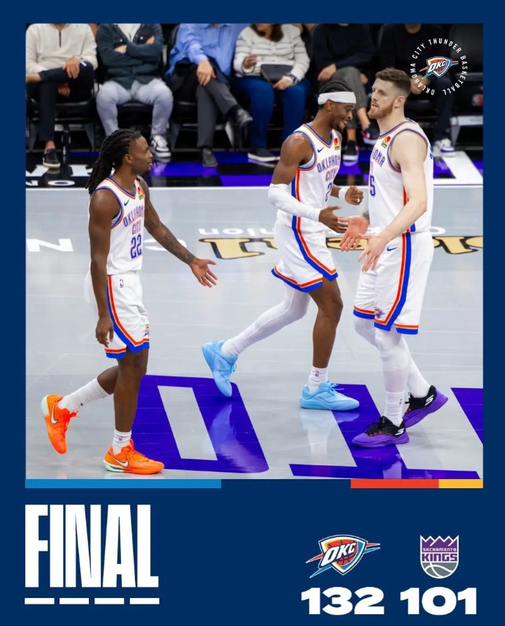 NBA杯小组赛:雷霆132-101战胜国王。 赛后,雷霆社媒分享本场赢球海报。