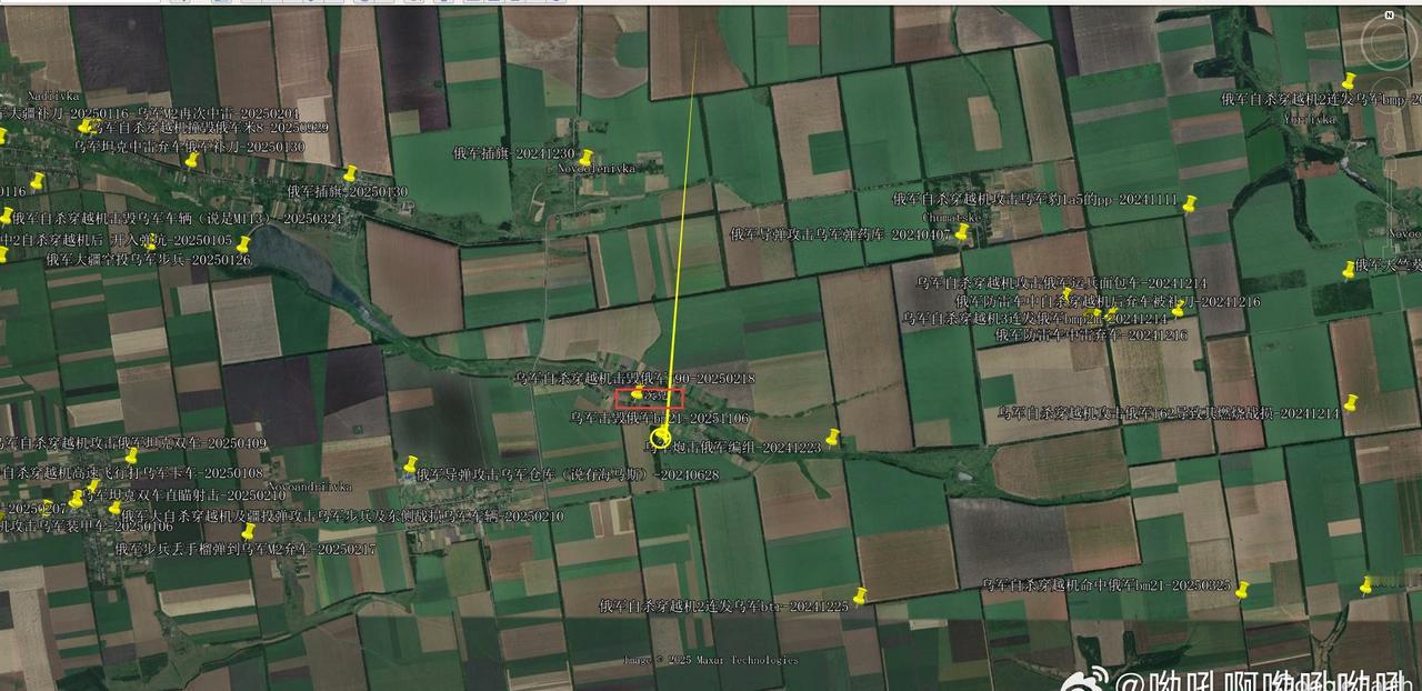 乌军59旅的视频 打了一个俄军的bm21,在卢茨克 Українка 红军村西南方向 发射时就被看到了,然后跟到他隐藏地,被乌军的巡飞弹击伤,然后乌军的自杀穿越机补刀,看树的颜色,是早1~2个月前的战果。我在乌方找点频道看到他抄的x上的洋人结果,我顺着抄来48.112877° 37.094979°