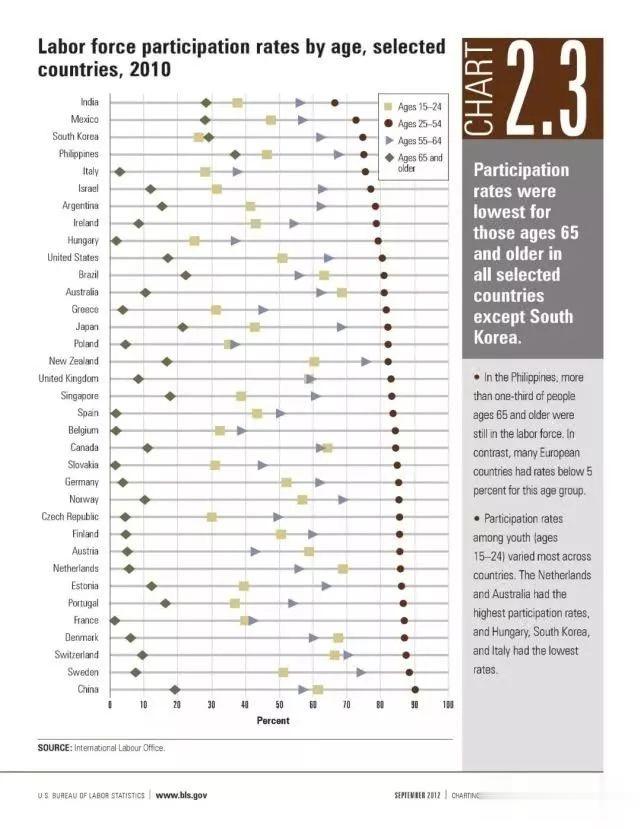 从图中可以看到,世界各国各年龄层的劳动参与率,中国达到惊人的90%,位列世界第一!