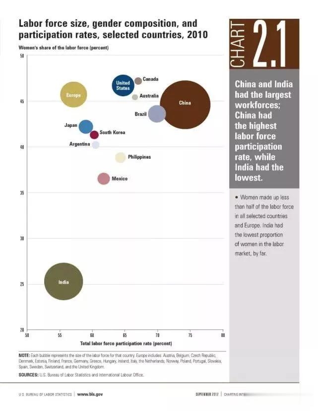上图显示了部分参与调查的各国劳动参与率,圆形的面积代表着国家劳动总量,图表的x轴(横轴)代表着劳动参与率,y轴(竖轴)则代表女性参与劳动比率。