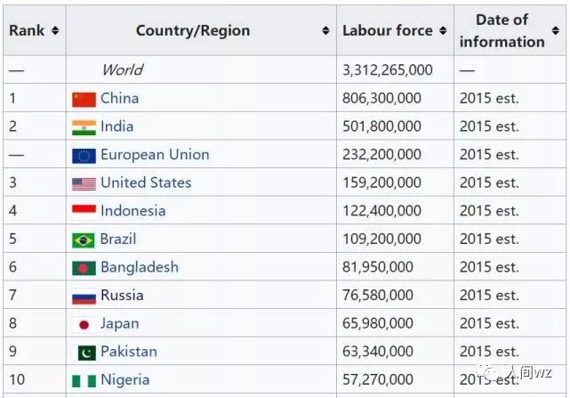 上图是世界劳动力资源排行,中国稳稳居于世界之首。