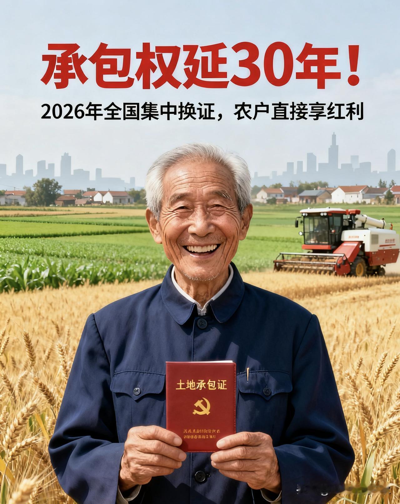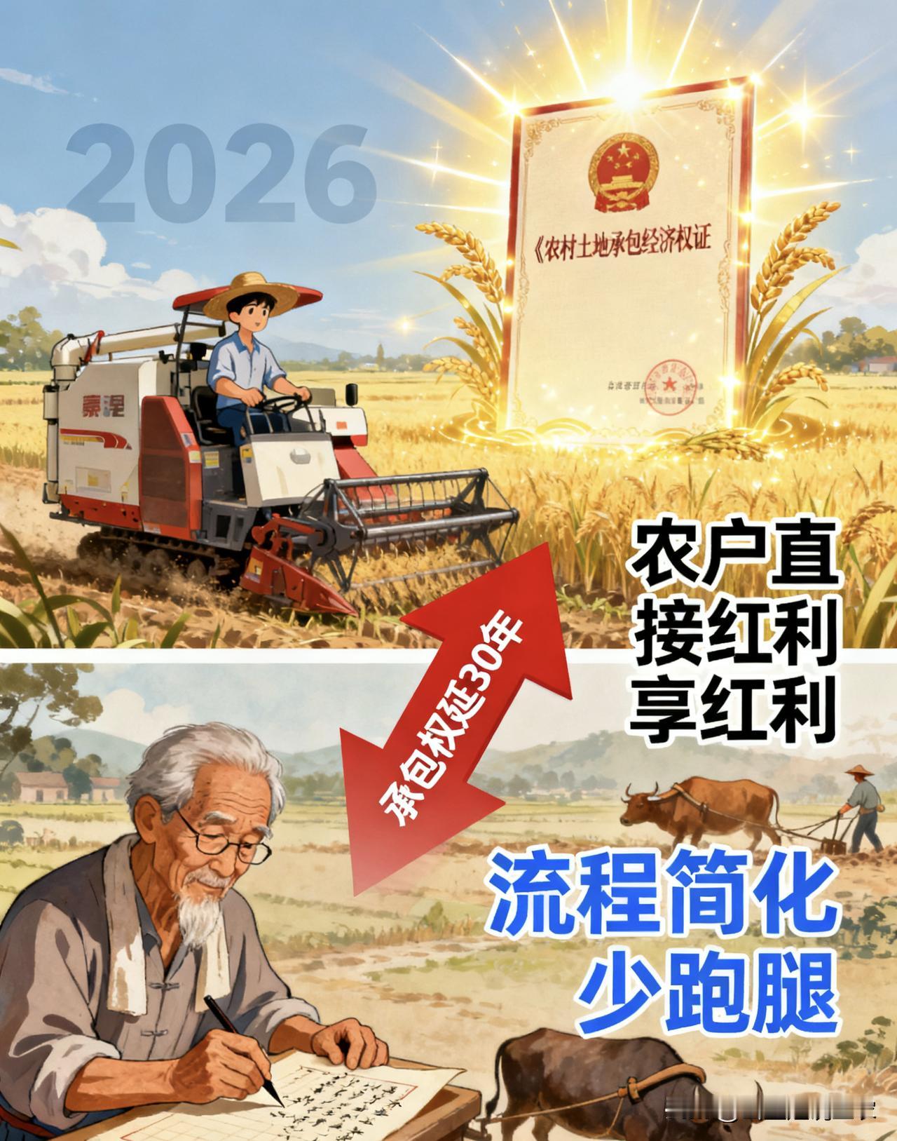 承包权延30年!2026年全国集中换证,农户直接享红利,流程简化少跑腿 2026年起,第二轮土地承包到期后再延长30年的政策将全面推进(依据《中共中央 国务院关于做好2025年全面推进乡村振兴重点工作的意见》),新承包期统一至2055年12月31日。不同于2025年的局部试点,2026年全国将正式进入集中签约与换证阶段,农户无需额外申请,符合条件即可自动享受政策红利,切实保障土地承包经营权稳定。 一、延包资格认定:这些情况不影响,3类情形除外 根据政策要求,农村集体成员的土地承包资格受法律保护,不因户口迁移、婚姻变动、外出就学、短期务工等原因丧失,承包地权益始终不变。 需注意3类不再纳入确权的情形: 1. 已死亡且未办理经营权继承的人员; 2. 已丧失中国国籍的人员; 3. 自愿提交书面申请放弃土地承包权的人员(参考《农村土地承包法》修订方向)。 二、办理流程大简化:2种情况对应处理,部分地区可线上办 为减少农户跑腿,本次延包换证流程大幅优化,按实际情况分类处理,提前备好材料更高效: - 无变化情况:携带原承包经营权证、户主身份证(部分地区可集体统一办理,无需个人到场),直接签订延包合同、领取新证; - 需变更情况:额外补充户口本(家庭成员变更)、地块变更证明(村集体出具)、书面变更申请(签字确认),审核通过后可网签备案,部分地区支持“线上申请+邮寄领证”。 【特别提示】“95%以上农户直接顺延”是山东、四川等多地试点的反馈数据,各地实际比例以当地政府公示为准;“流程简化、少跑腿”是试点地区农户的实际体验描述,非全国统一时限承诺,具体办理进度以当地通知为准。 三、3个查询渠道+电话获取方式,快速核实本地政策 想查询自家承包地延包进度、宅基地确权所需材料,或咨询本地具体要求,可通过以下方式高效办理: 1. 线上查询:登录当地农业农村局官网,或关注其官方微信公众号,在“政策解读”“政务服务”栏目中搜索关键词即可; 2. 线下咨询:前往乡镇政务服务中心“土地确权专窗”,工作人员一对一解答指导; 3. 政务APP办理:手机下载本地官方政务APP(如浙江“浙里办”、安徽“皖事通”等),搜索“土地承包延包”可在线查询、预约;不确定APP名称的,在应用商店搜索“XX省政务服务”即可找到。 【地方政策查询电话获取】:拨打全国政务服务便民热线12345,转接“农业农村局政策咨询”;或通过当地农业农村局官网“联系我们”栏目,查询公开咨询电话,直接沟通核实。 四、历史遗留问题:老房屋确权这样算 对于1987年1月1日《土地管理法》实施前建造的房屋,且长期由农户合法使用、未发生权属争议的,在宅基地确权时将按实际情况认定,具体标准以当地自然资源部门公示的细则为准(各地政策有差异,需结合本地规定执行)。 土地承包权延长是关系农民切身利益的大事,流程简化、权益有保障!建议大家转发给身边农户、家人朋友,让更多人知晓政策、提前准备;如果你的家乡已经开始办理,或有具体疑问,欢迎在评论区分享本地办理经验、交流政策细节,互相帮衬少走弯路~ 土地承包新动态 农村土地延包 二轮土地延包