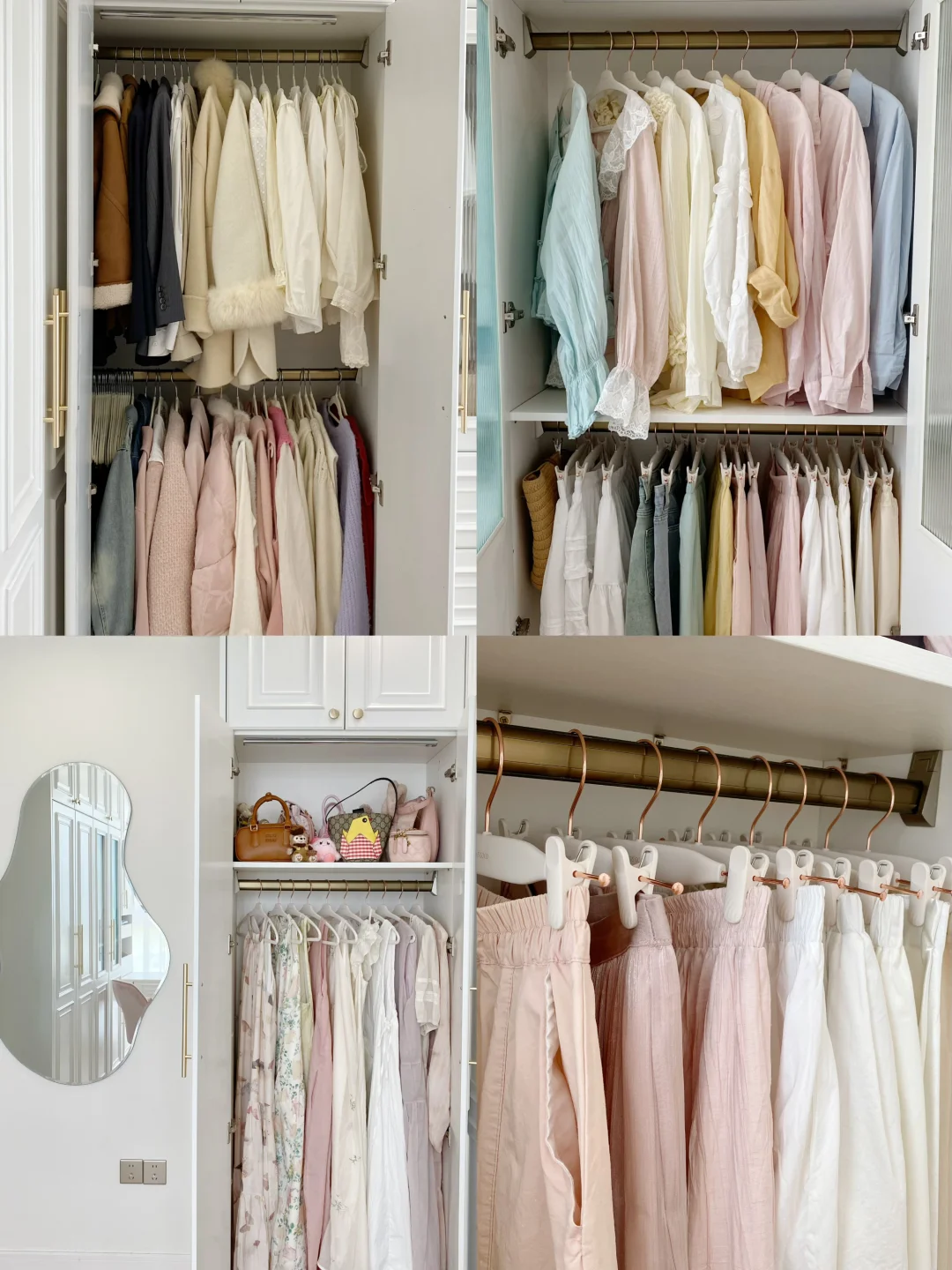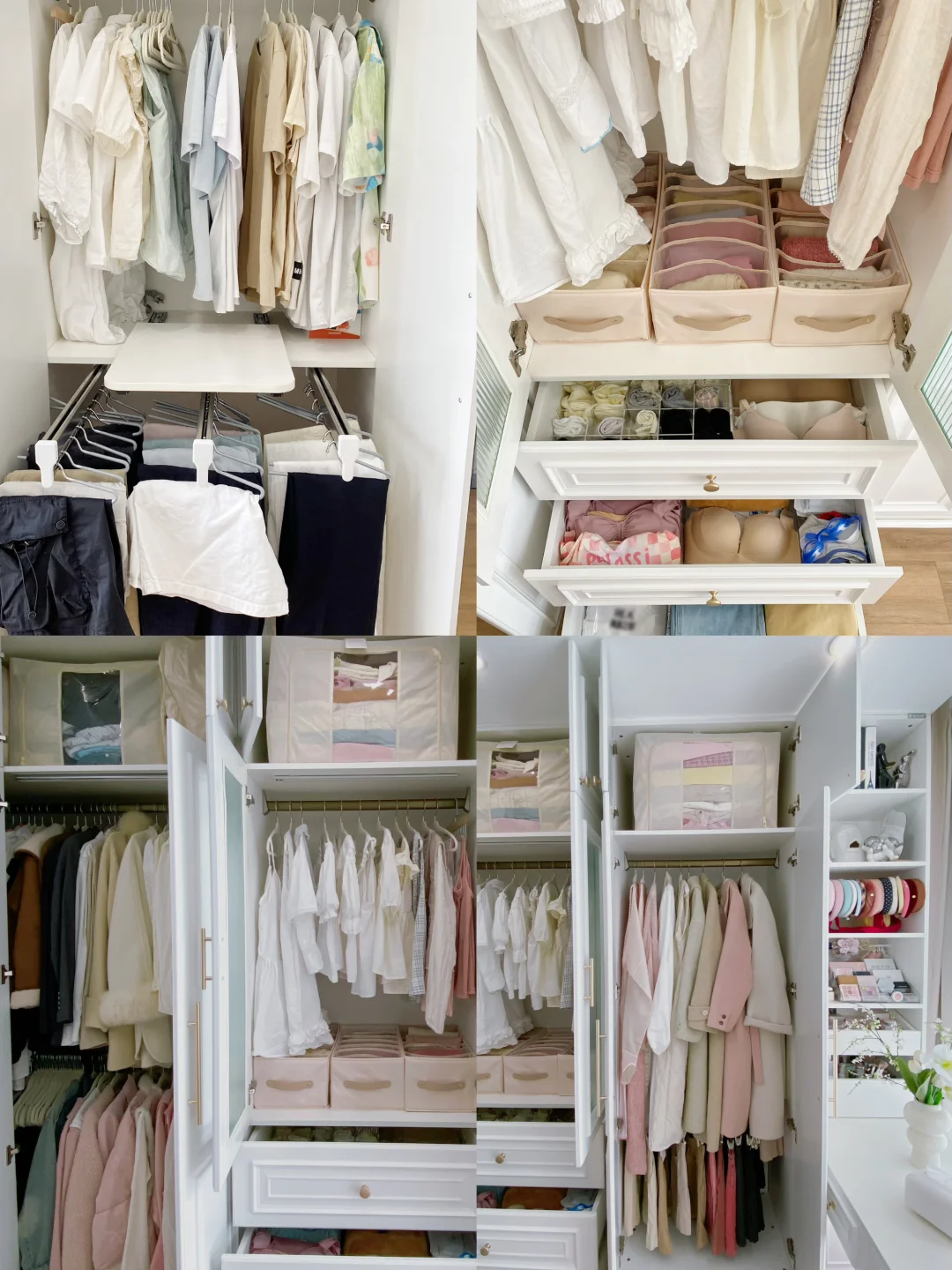 内部收纳布局这块我真的做了很久功课,像我家根据长衣、短衣、裤子、裙子👗、首饰💍、护肤品、都做了对应分区收纳,不浪费空间的同时还整齐有序!