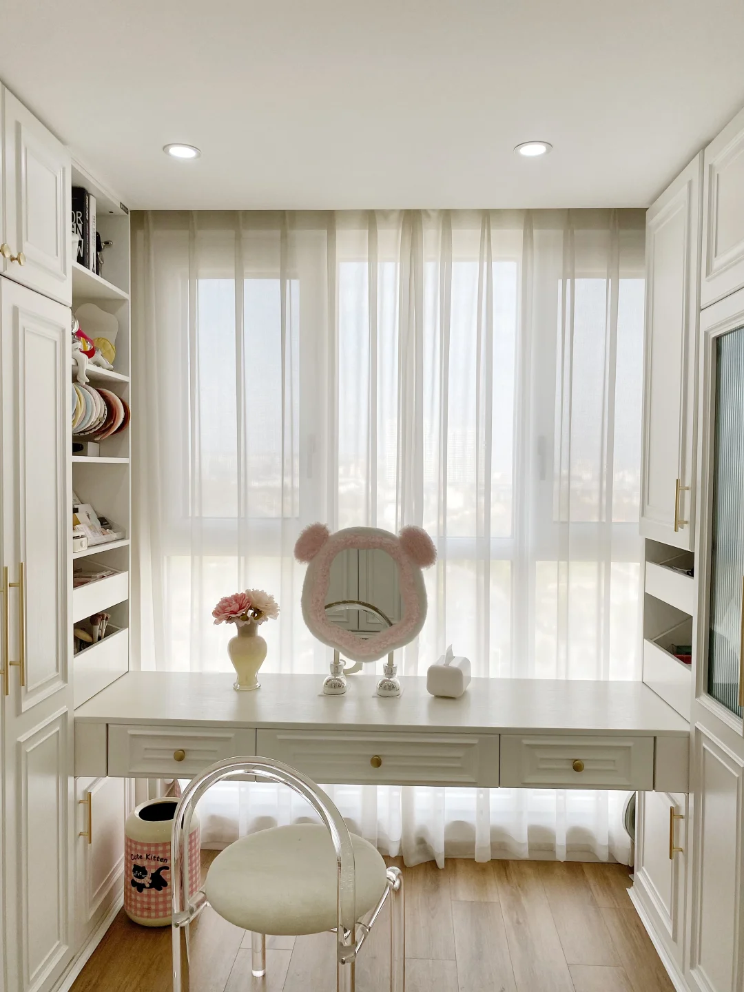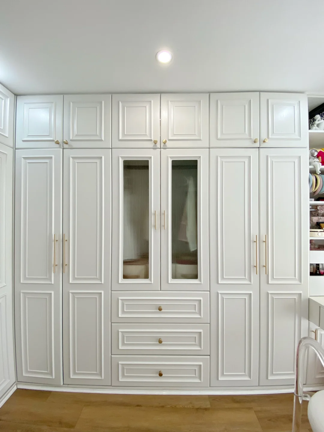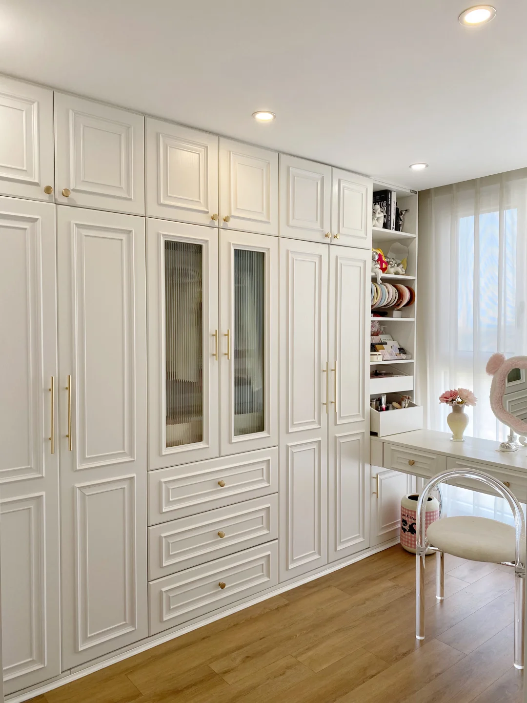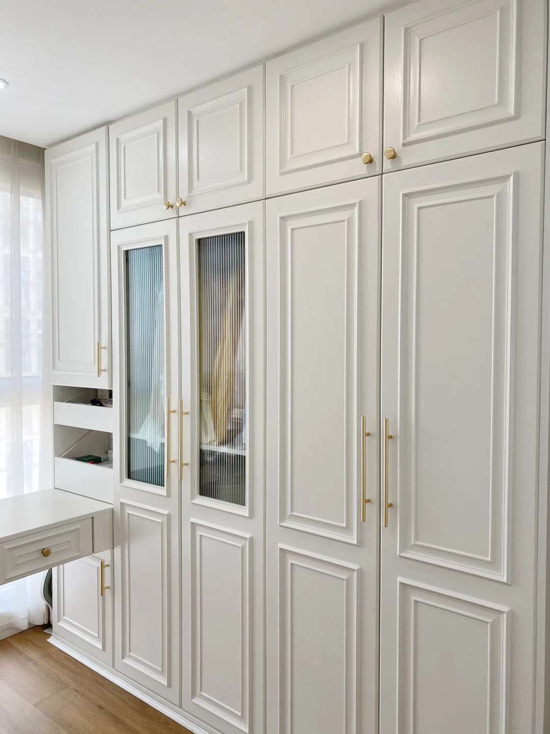 我家全屋柜子属于美式轻奢风,柜门选择了中性白,做了回字形线条,入住快4年,没有出现发黄的情况,比平板门看起来会更加有层次高级一点[赞R]!