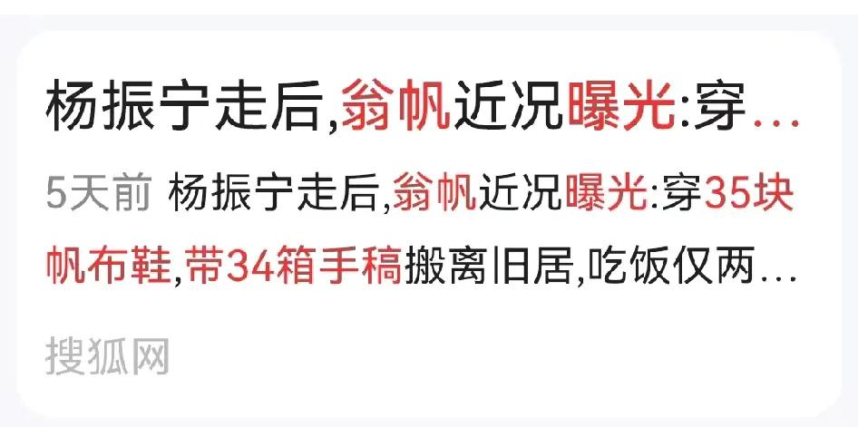 翁帆的坚守:35元帆布鞋下的学术传承 杨振宁离世后,49岁的翁帆穿着35元的帆布鞋,搬离别墅,带着34箱手稿住进清华园的普通公寓。 每日两荤一素的食堂简餐,伏案整理至深夜——她守的不是房产,而是一代科学巨匠的毕生心血。 总有人揣测“老夫少妻”的利益纠葛,可翁帆用行动撕碎了这些偏见。她没借名气谋利,反而像“学术守门人”一般,默默梳理每一页珍贵的研究成果。 这些手稿不仅是杨振宁的智慧结晶,更是他报效祖国的见证。翁帆的坚持,让这份遗产得以传承,而非湮没在时光里。 对比那些蹭热度、博眼球的人,她的朴素与专注显得尤为珍贵。深夜的灯光下,她校对的是科学,点亮的却是责任与真情。 这世上,最动人的从来不是喧嚣的誓言,而是无声的守护。 你怎么看这份超越物质的坚守? 评论区聊聊吧!