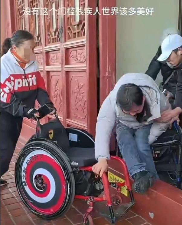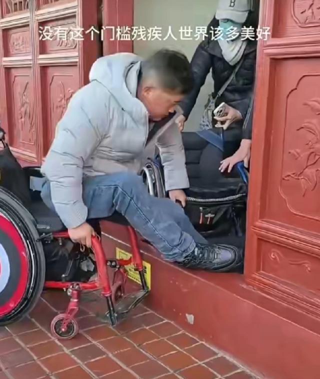 残疾人朋友想进古建里参观,被一道门槛难住了,还配文“要是没有门槛世界该多美好”!