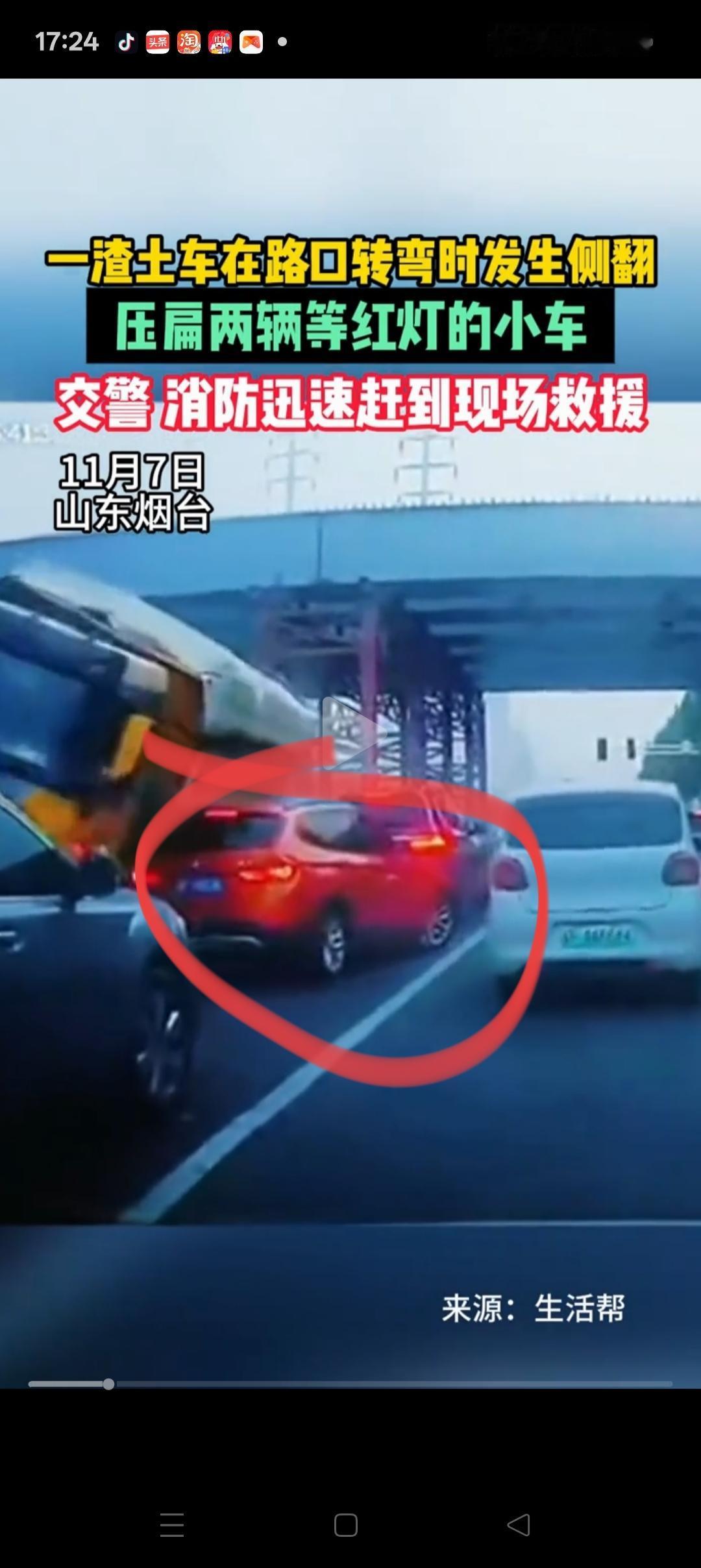 烟台大货车侧翻, 最痛心的就是这辆红色小车了[祈祷], 他其实已经注意到了货车可能会翻车,已经开始打方向了。但不知道怎么回事,又停了一下,就这么短短的1秒钟啊,就被压在石块下了,好可惜 仔细看了下,他是油车,且前面的车阻挡了他的路线,大概是不想撞前车吧。 可惜他太善良了,犹豫了就那么一秒钟。 如果他当时能果断一些,直接加大踩油门,还是有机会躲过去的,好心痛呀[流泪][流泪]