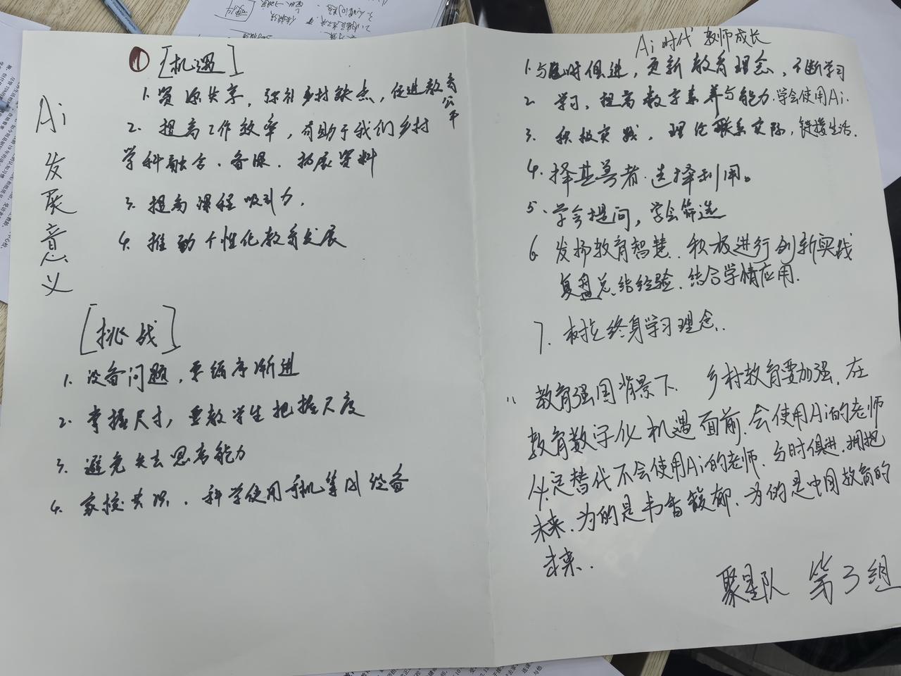 乘AI之风,循教育本真:乡村教育在机遇与挑战中的破局之道 当人工智能的浪潮席卷教育领域,乡村教育既迎来资源共享、效率提升的发展机遇,也面临设备短缺、思维依赖的现实挑战。透过三组教育工作者的深度思考,我们得以窥见乡村教育在时代变革中的破局路径——以技术为翼,以育人为核,在机遇与挑战的平衡中实现与时俱进。 一、AI赋能:乡村教育的机遇之窗 在“AI在乡村教育”与“AI发展意义”两组的探讨中,人工智能对乡村教育的赋能价值清晰可见。 从资源维度看,AI打破了乡村教育的资源壁垒。它能实现优质课程、教研成果的跨地域共享,弥补乡村音体美、科创类资源的先天不足,让教育公平从理念走向实践。正如第三组所言,AI“资源共享,弥补乡村缺点,促进教育公平”,为乡村孩子打开了接触多元知识的窗口。 从效率维度看,AI重塑了乡村教师的工作模式。教师可借助AI工具优化备课流程、设计个性化活动、跟踪学生成长轨迹,将更多精力投入到育人本身。第一组提到,AI能助力教师“备课、上课、活动设计、成长跟进”,极大提升了教学效能。 从学习维度看,AI为乡村学生打造了沉浸式学习体验。它以直观的形式呈现复杂知识、提供实时答疑,让抽象的数理化、陌生的艺术领域变得可感可触。第一组指出,AI能为学生带来“直观感受、新媒介新形式、呈范例、解疑难”的学习体验,激发了乡村孩子的求知欲。 二、现实叩问:AI落地的挑战之壁 机遇背后,三组也共同关注到AI在乡村教育落地的多重挑战,这些挑战既是技术适配的问题,更是教育本质的叩问。 硬件与认知的双重制约是第一道关卡。乡村学校普遍面临设备不足、网络不稳定的困境,而部分家长对电子设备的使用存在顾虑,导致AI工具“无米下锅”或“有米难炊”。第三组直言“设备问题,要循序渐进”“家校共识,科学使用手机等网络设备”,道出了基础设施与观念认知的双重短板。 教育尺度的把握难题是第二重考验。当AI能快速给出答案、生成内容时,教师如何引导学生“避免失去思考能力”(第三组),如何平衡技术辅助与思维培养的关系?第一组警示AI可能导致学生“对思维辩证的影响、依赖”,提醒我们警惕技术沦为思维的“替代者”而非“辅助者”。 伦理与本质的深层追问是第三重挑战。AI的应用涉及数据隐私、内容分级、伦理边界等问题,更关乎教育“育人”的核心。第一组强调要关注“法律、伦理、分级、明辨、思维隐私”,第二组提出需通过“心理辅导、活动育人”守住教育本真,这些思考直指技术应用的伦理底线与教育本质。 三、破局之道:教师引领的成长之路 面对机遇与挑战的博弈,三组的共识指向了同一个破局关键——教师的主动成长与教育的与时俱进。 (一)更新理念,拥抱技术 教师需率先打破“经验主义”的桎梏,以“终身学习”的姿态接纳AI。第三组提出教师要“更新教育理念,不断学习,提高教学素养与能力,学会使用AI”,第一组也强调乡村教师要通过“学习、转变思想”实现自我迭代。唯有教师先成为技术的“明白人”,才能引领学生成为技术的“善用者”。 (二)创新实践,守正出奇 在教学实践中,教师要将AI作为“工具”而非“主宰”。可借鉴第一组的“设计思考型的项目式学习”,用AI辅助资料收集、创意激发,而将分析、决策、反思的环节留给学生;也可参考第二组的“分层教学、创新调整”,利用AI的个性化优势,为不同基础的学生定制学习路径,让技术服务于“因材施教”的教育理想。 (三)协同联动,整合资源 单枪匹马难成气候,三组均强调“协同”的力量。可通过“教研联动”(第二组)整合区域内的教师智慧,通过“寻求支援”(第二组)链接城市优质资源,通过“家校协同”(第三组)凝聚育人合力。正如第二组所言,要“营造同伴互助氛围,彼此支持”,让AI在多方联动中发挥最大效能。 结语:以人驭技,方得始终 从三组的探讨中,我们看到了乡村教育在AI时代的清晰图景:它不是技术对教育的简单改造,而是以技术为舟,载着“育人”的内核驶向更广阔的未来。 乡村教师作为这艘航船的“舵手”,需既懂技术的“器”,又明教育的“道”——以AI拓展资源、提升效率,同时以人文关怀守护思维的火花、伦理的底线。唯有如此,才能让AI真正成为乡村教育的“东风”,推动乡村孩子在知识的海洋中扬帆远航,也让乡村教育在时代的浪潮中,走出一条“顺势而为,与时俱进”的破局之路。