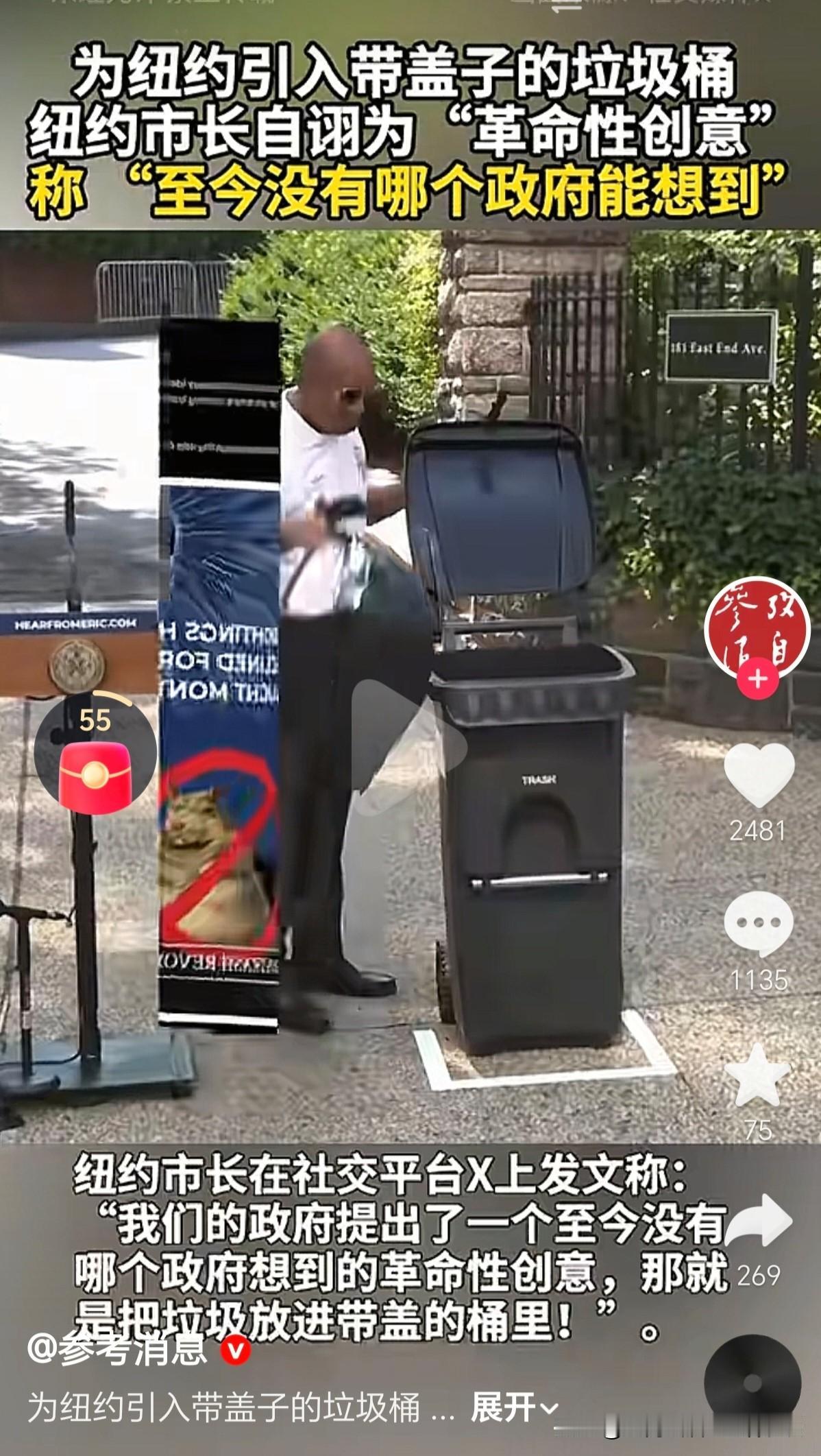 纽约引进了带盖子的垃圾桶,该市市长在社交平台上发文,骄傲表示:这是一项革命性的创意,至今没有哪个政府能够想到,把垃圾放入带盖子的垃圾桶里。 刚开始,我还以为这是几十年前的新闻,再仔细一看,这是近期的新闻。难道纽约以前,公共区域没有带盖子的垃圾桶吗? 在中国,这种垃圾桶,很久以前,在农村就有了,更别说城镇里。难道纽约街头从来没有使用过?
