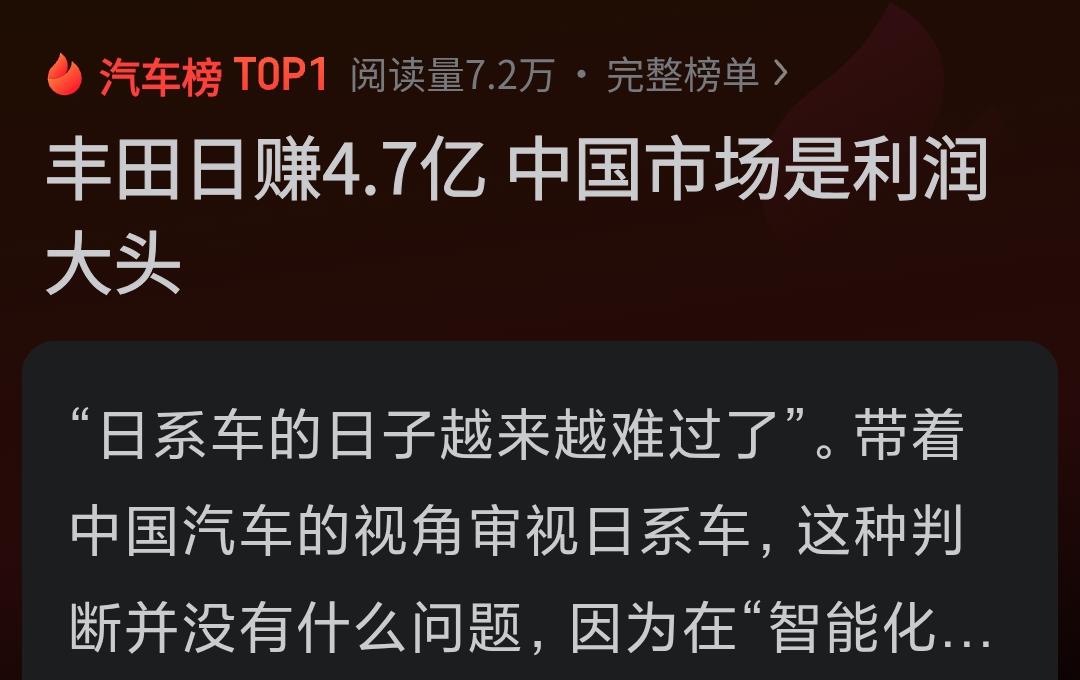 丰田在中国市场依旧赚得盆满钵满。 自国内各大造车企业崭露头角,不少人觉得日本车企要走下坡路了,认为它们在中国轻松赚大钱的日子已一去不复返。 当国人以为日本车企会减少在华投产、日本造车利润会大幅下滑时,却没料到日系车在我国依旧畅销,销售形势十分火热。 日系车在中国车市走俏,在中国赚处的利润依旧最为大。 消费者消费时,只要看中自己心仪的产品就会出手购买。 只要外国品牌汽车还在我国市场存在一天,对我们消费者而言,就不是什么坏事,至少可以平衡物价,让消费者有更多汽车品牌可供选择。 哪个汽车更质优价廉,我就选哪个。 大家觉得呢?