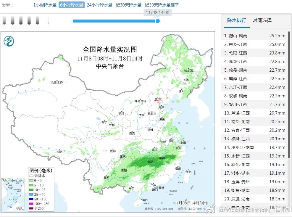 【降水】今天08-14时,云南东南部、贵州、湖南、江西等地在副高北侧边缘,冷暖交