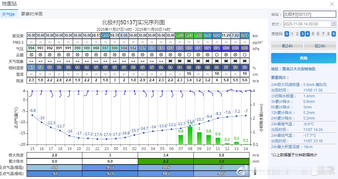 【降水】今天08-14时,云南东南部、贵州、湖南、江西等地在副高北侧边缘,冷暖交汇之下出现降雨。湖南江西部分站点降水量超20毫米,包揽6小时降水榜前十。内蒙古东部和黑龙江多地,因为冷涡影响,出现降雪。截至14时,黑龙江北极村降雪量已达5.2毫米,大雪级别,在原先积雪基础上,积雪增厚到19厘米。