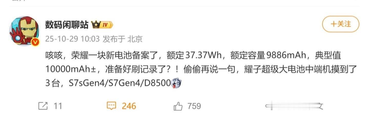 该博主 10 月 29 日发文称,荣耀新电池已备案,额定 37.37Wh,额定容量 9886mAh,典型值 10000mAh±。