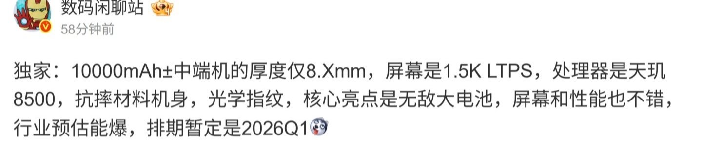 该博主还称 10000mAh± 中端机厚度只有 8.X mm,配备 1.5K LTPS 屏幕,处理器是联发科天玑 8500,拥有抗摔材料机身、光学屏幕指纹,核心亮点是“无敌大电池”,屏幕和性能“也不错”,行业预估“能爆”,排期暂定 2026 年第一季度。结合博主文中暗示和评论区猜测,预计这台手机是荣耀 Power 2。