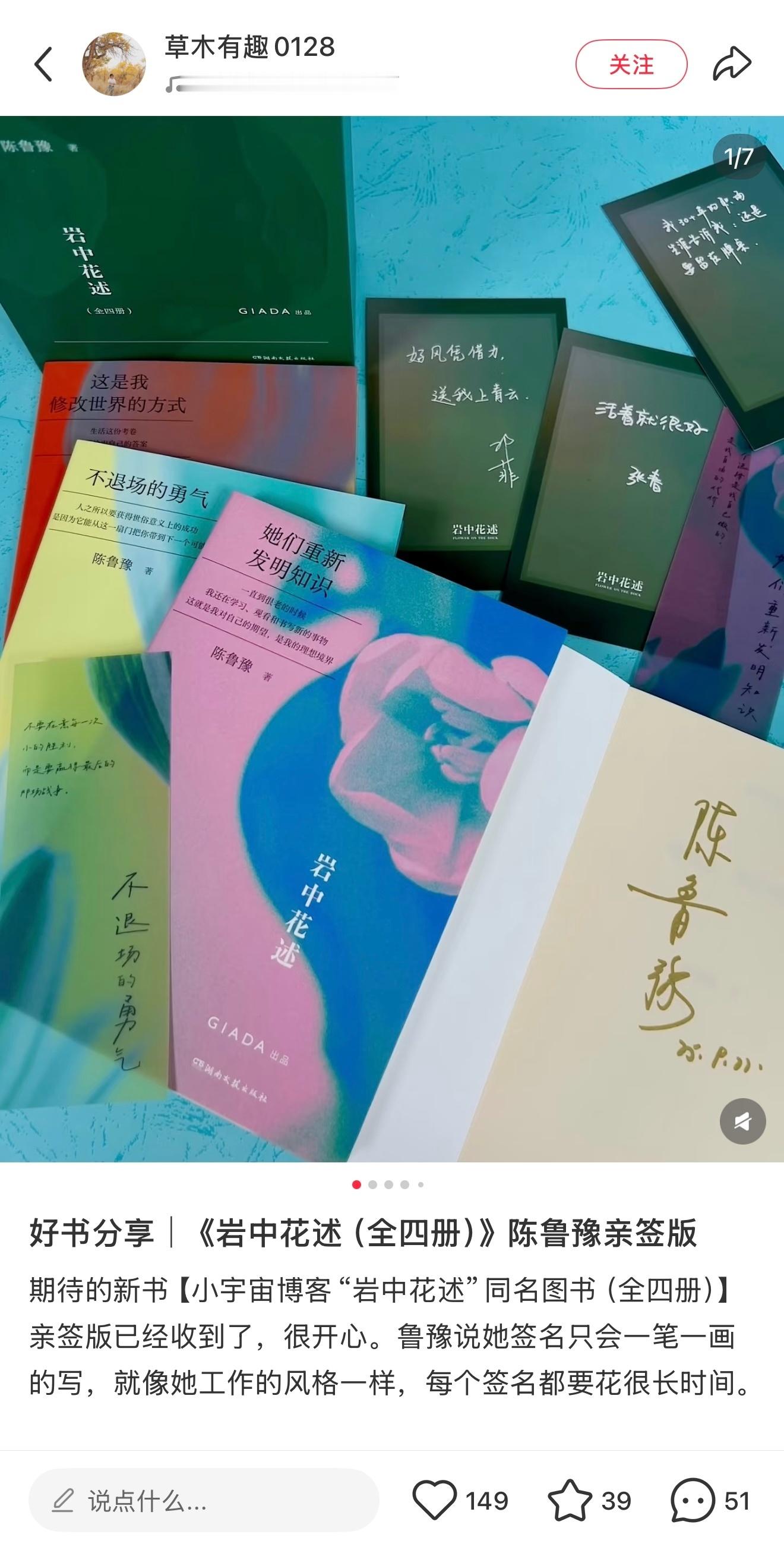 鲁豫签名签出腱鞘炎这大概是文化人最浪漫的“工伤”!鲁豫为《岩中花述》签售亲手写下近万次名字,一笔一画认真到磨出老茧。