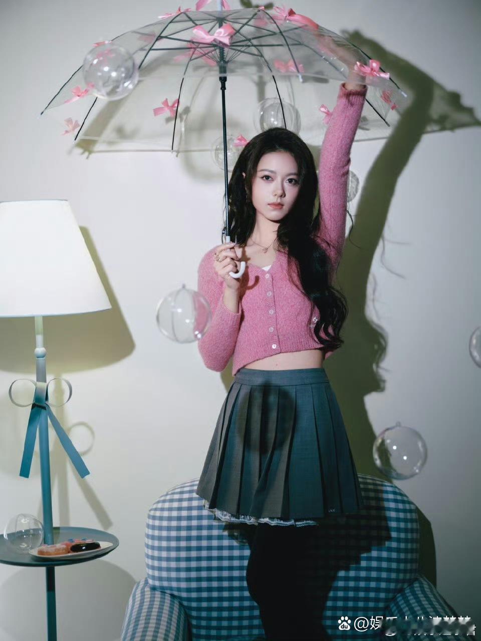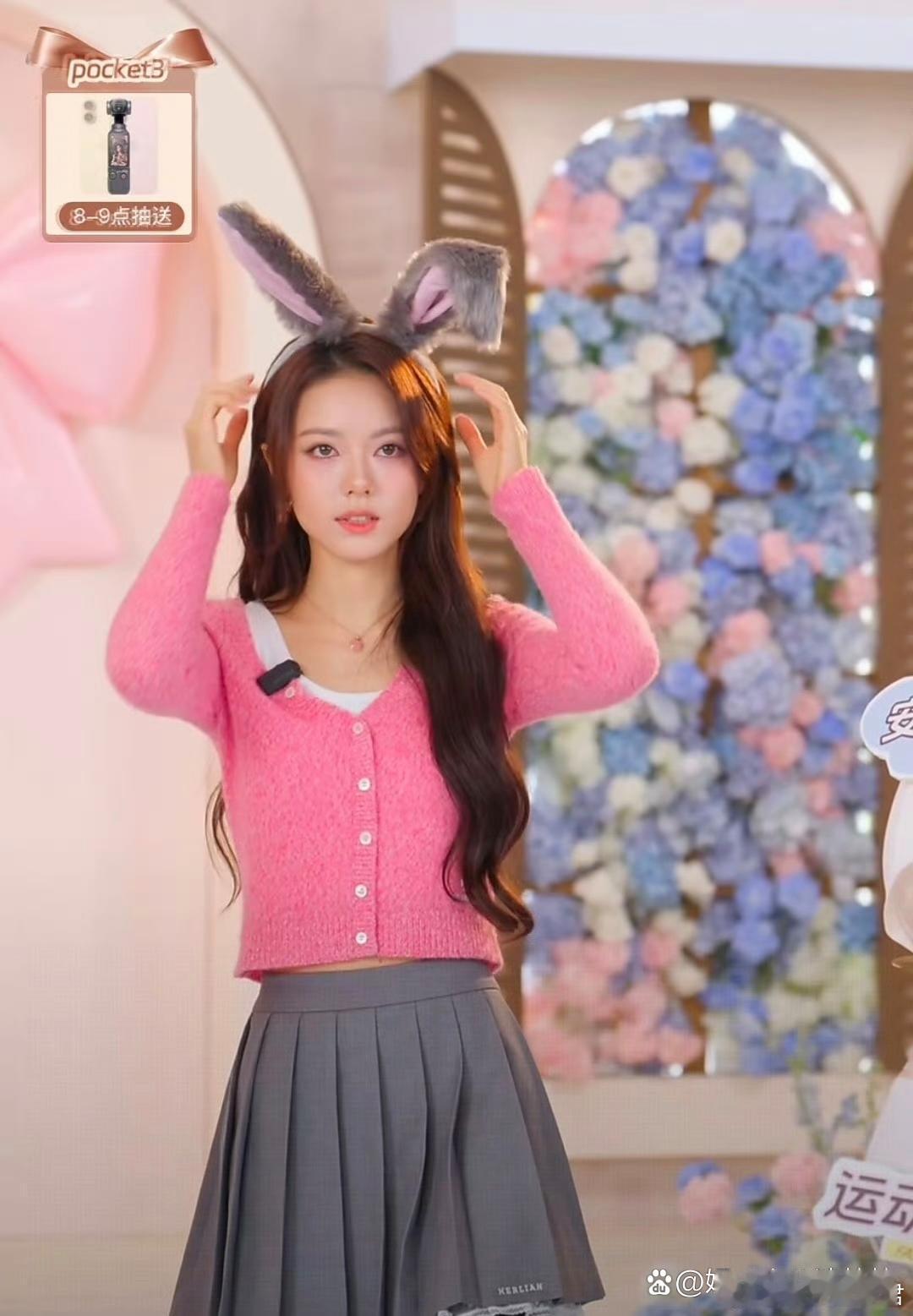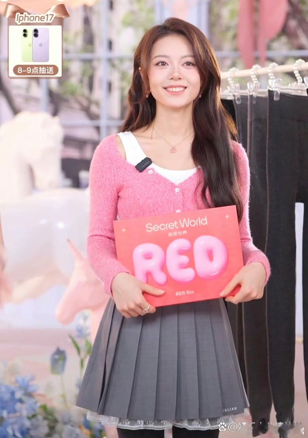 赵今麦今日出席SecretWorld直播造型图集,身着粉色针织衫搭配灰色百褶裙,佩戴Pomellato宝曼兰朵珠宝,元气满满的美丽麦麦,