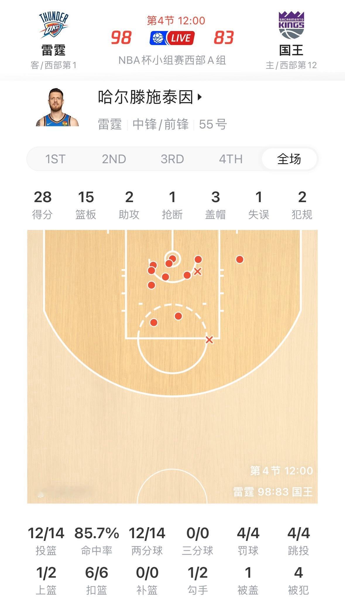 哈藤三节28分15板3盖帽,投篮14中12。