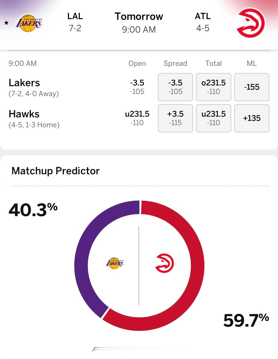 湖人明日9点客场对阵老鹰,ESPN给出获胜概率:湖人40.3%、老鹰59.7%。