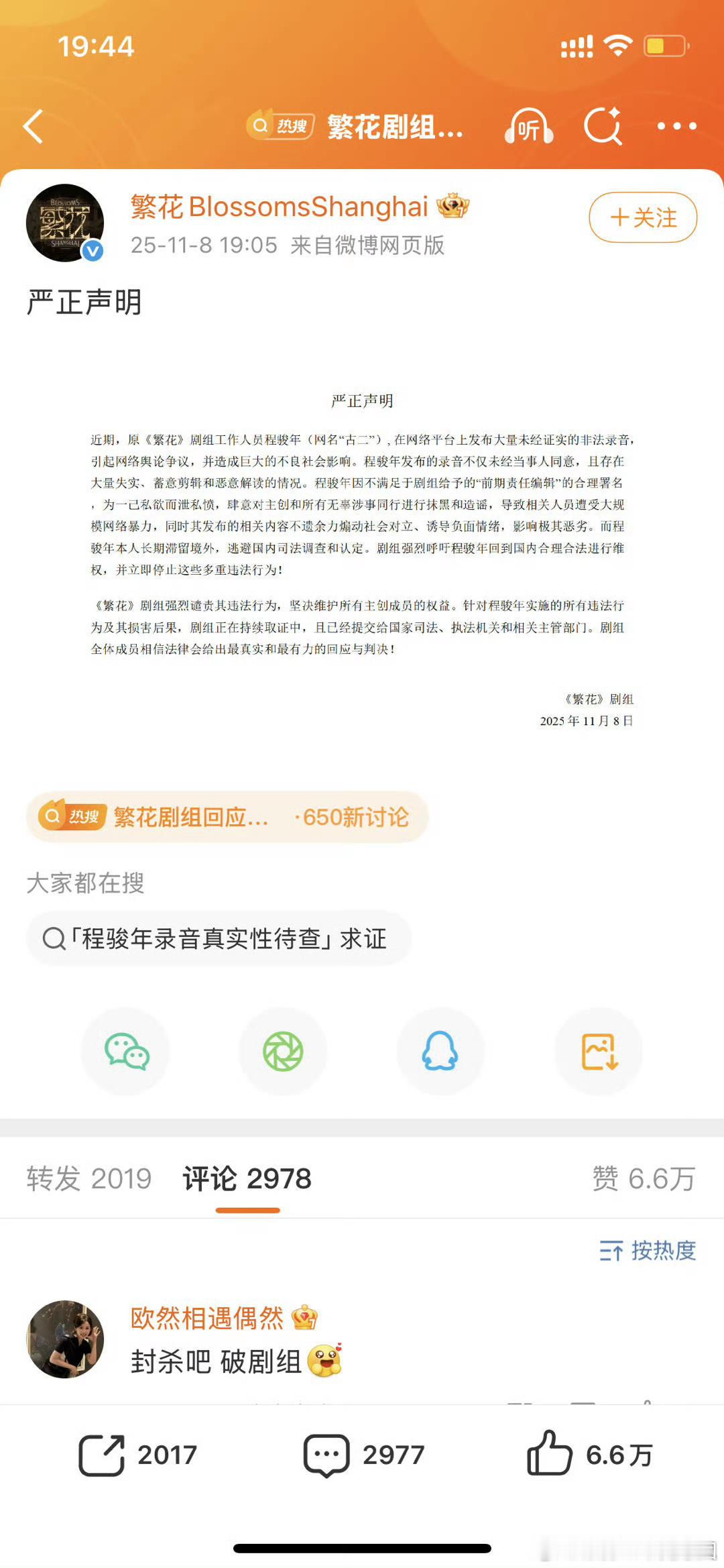繁花剧组回应古二录音繁花剧组声明称古二发布的关于主创人员的录音存在严重失实,有网友认为繁花剧组应该被封鲨,目前这条评论已经被繁花剧组删了,你们怎么看🤔 ​​​