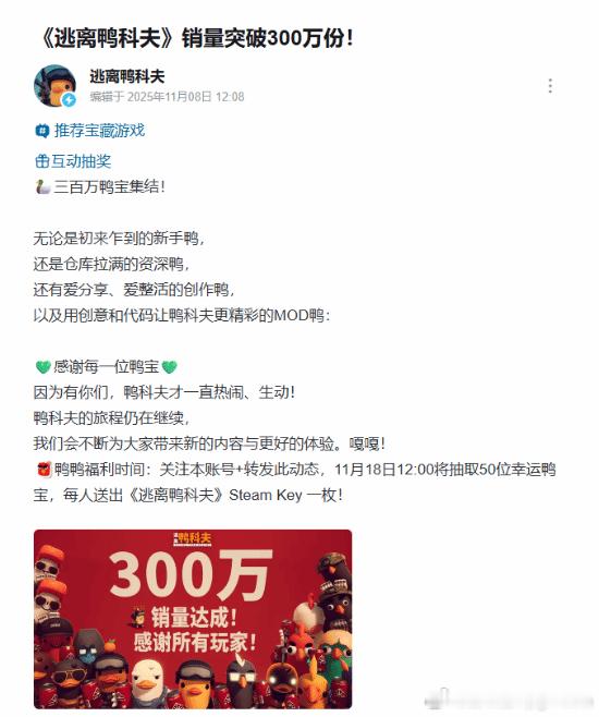 今日,《逃离鸭科夫》官方宣布,游戏销量突破300万份,并感谢每一位购买游戏的玩家,开发者会不断为大家带来新的内容与更好的体验。