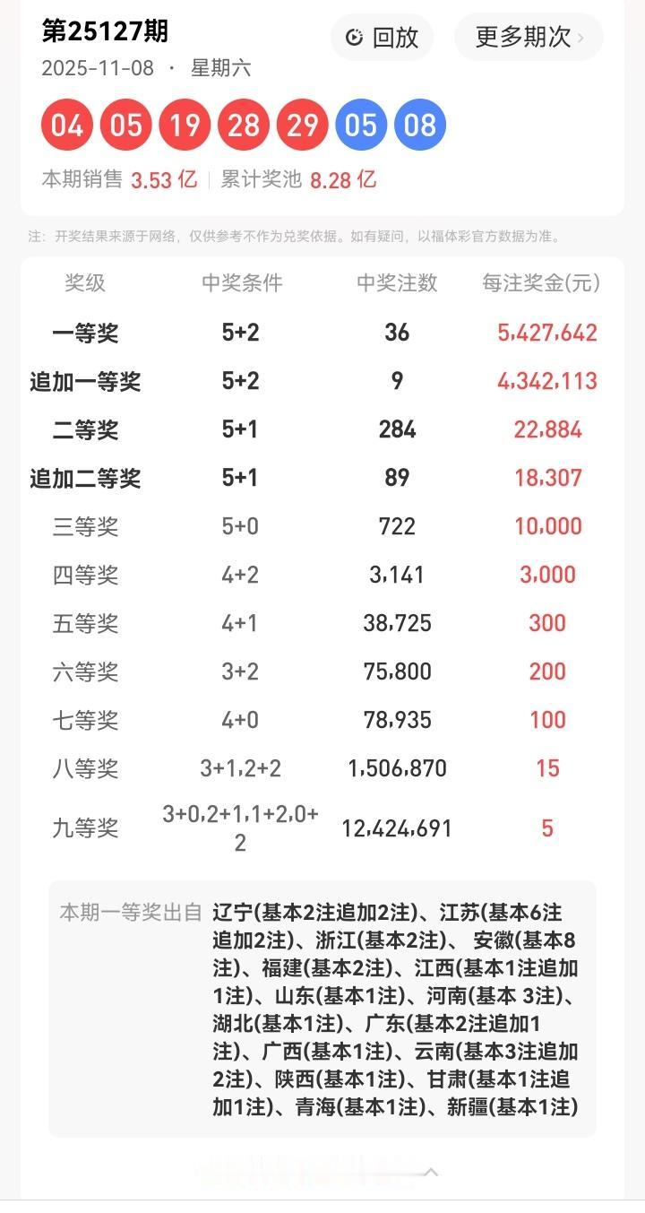 11月8号星期六,大乐透开奖号码揭晓:04、05、19、28、29—05、08。本期大乐透开奖号码前区红球开出了两组连号04、05和28、29号,开出了一组十进制同尾号19、29号,后区蓝球开出了05、08号组合。 本期大乐透开奖号码前区红球开出了两组连号,没有重号开出,难度不大。一等奖爆发出36注,单注奖金542万多元,追加一等奖开出9注,单注奖金434万元。一等奖中奖分布在十几个省份,没有单一省份中奖在十注以上的。
