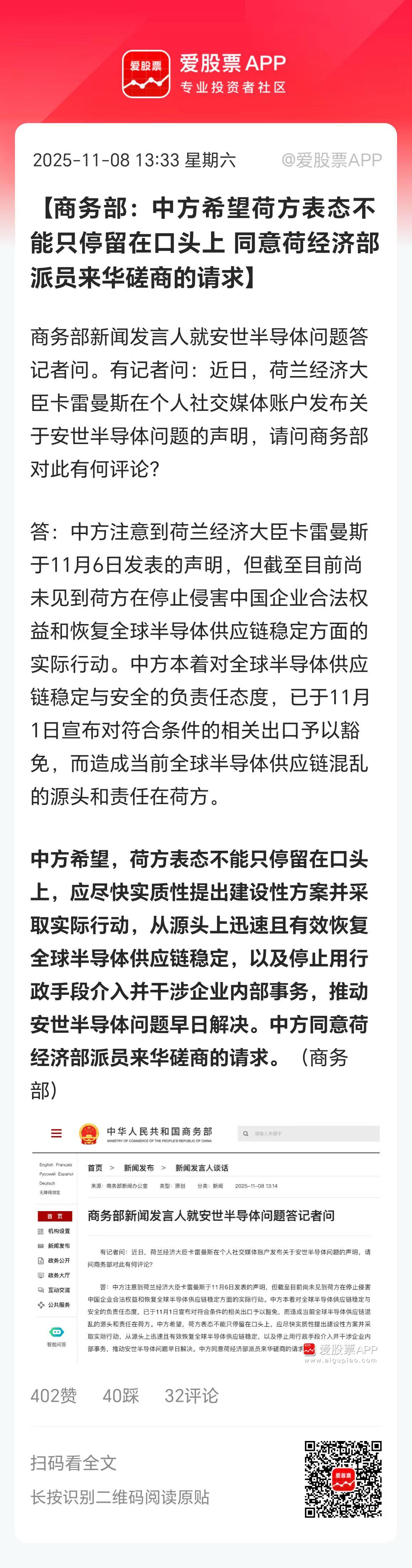荷兰说,准备暂停对安世半导体的控制令,恢复其中国股东的控制权。 这可以理解为荷兰认怂了,举起了“白旗”。不过现在还停留在嘴炮,我们商务部也说了:“不能只停留在口头上,要拿出实际行动”! 我们同意荷方来华磋商,但对于荷兰这种“打劫”的事儿,我们真不能惯着。这一仗我们打的不是一家企业,而是中国企业出海的信心。 所以,不是想抢劫就抢劫,想归还就归还的。以为还回来就想全身而退?天下哪有这么便宜的事?这次必须给荷兰一点教训,也给其他想搞事的国家立立规矩。