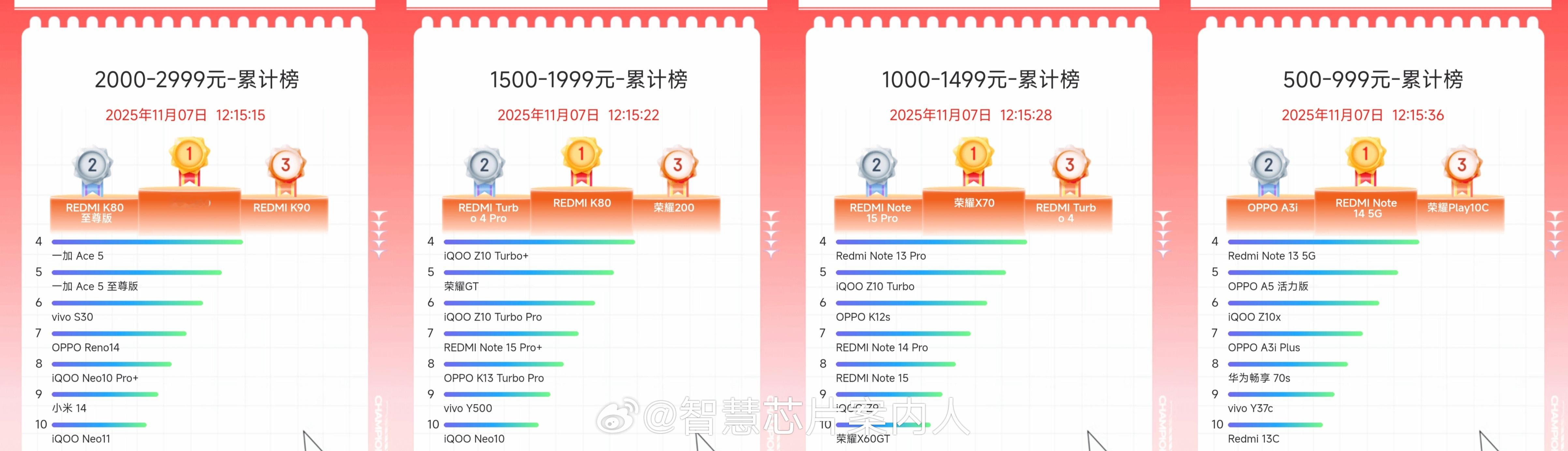 1-1.5K: 荣耀X70,Note15P,Turbo4