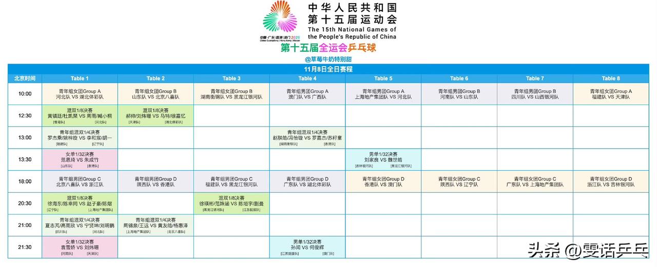 第十五届全国运动会·乒乓球项目 11.8 21:30场 共2场赛果 一、男单1/32决赛 孙闻(江苏挺拔队)4-0何俊辉(澳门队)【11-5,11-4,11-7,11-5】 二、女单1/32决赛 刘炜珊(天津队)4-1袁雪娇(河南队)【3-11,11-8,11-9,11-8,12-10】