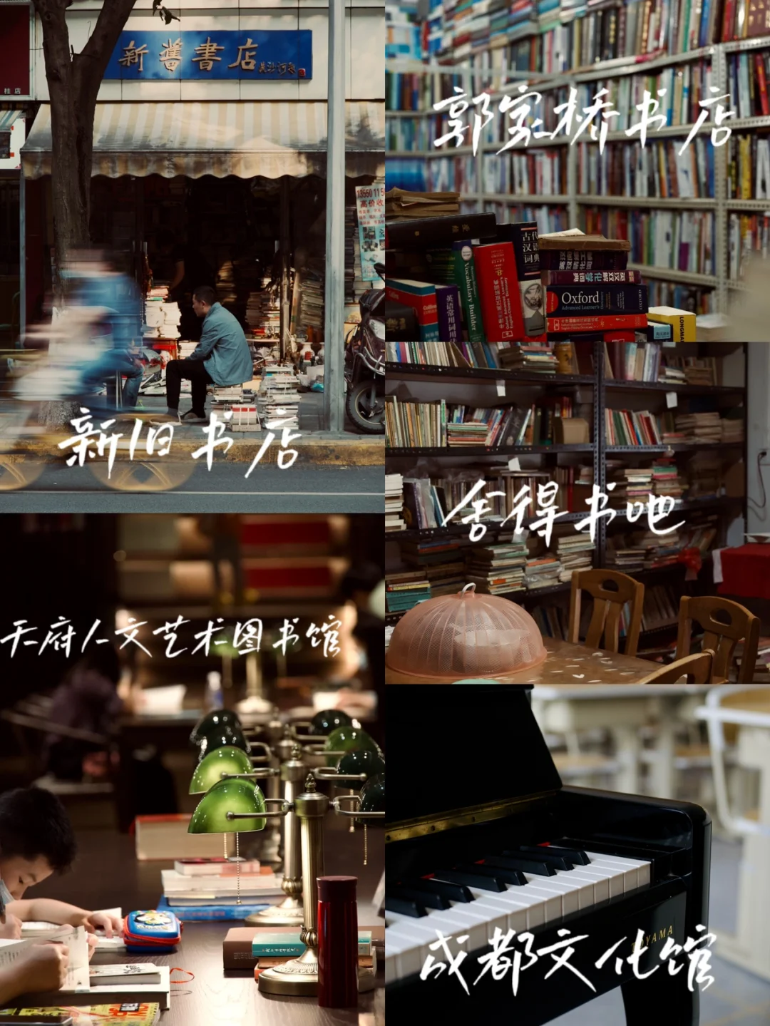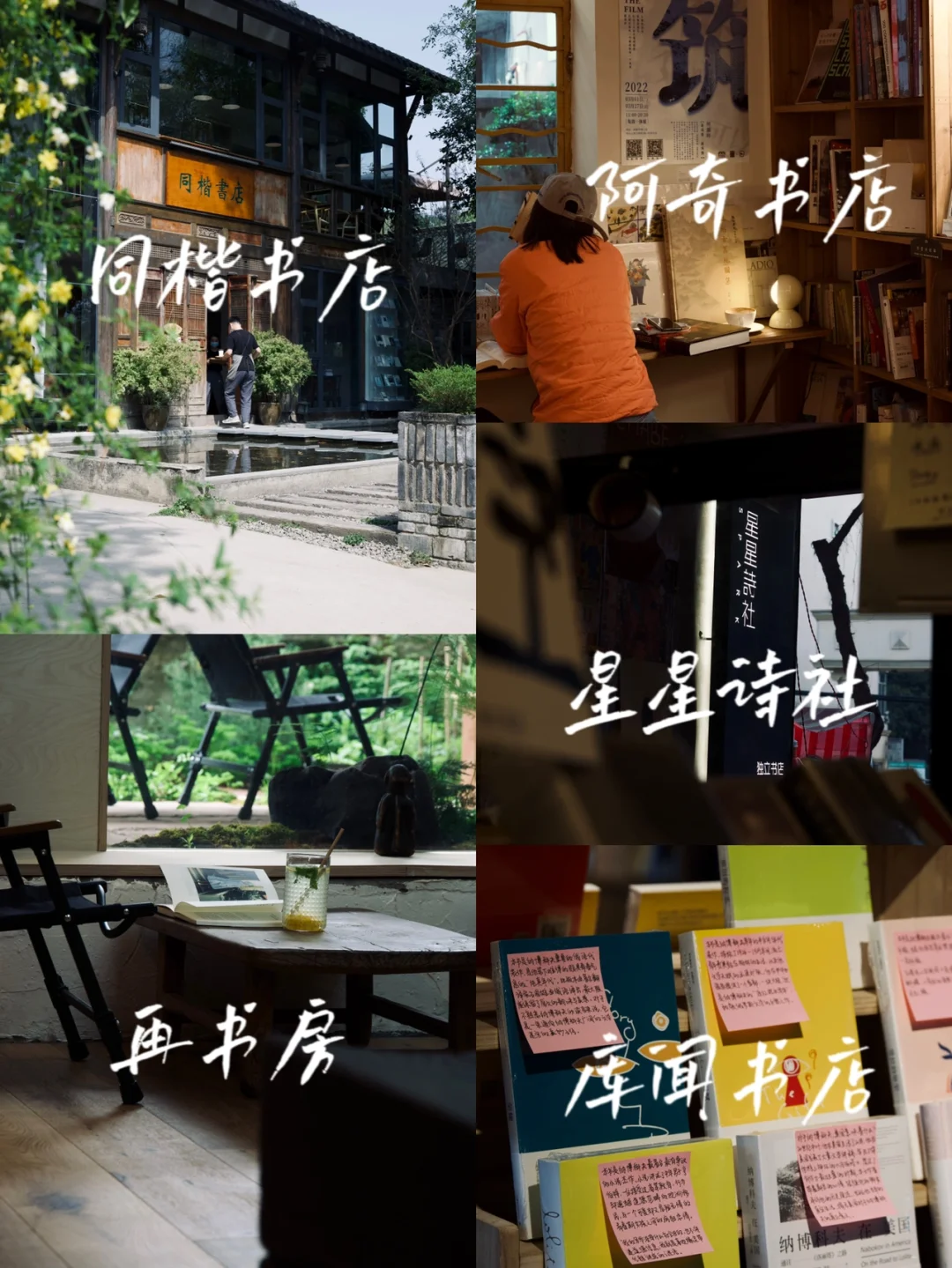 “长野书局”可借书,“浮于野书店”认真买书的酒吧,只卖诗集,“读本屋”书都有折扣,“一苇书坊”文化活动丰富,“大地书房”营业时间长全自助,“星星诗社”不卖书只可看书,“同楷书店”环境棒,“阿奇书店“可看展的书店,”再书房“主打建筑艺术的书店,还有香料🪴园。“库闻书店”可以听川大教授的讲座。