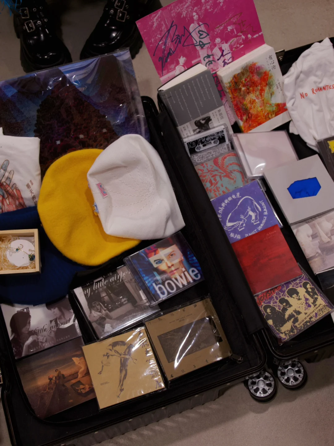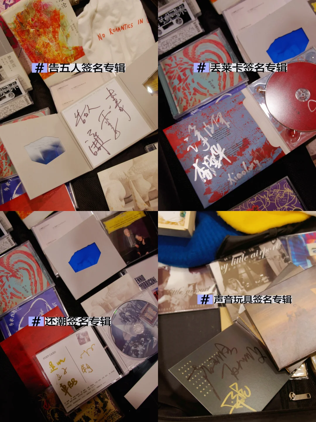 集市主要有古早饰品💍、特色文创📒、潮流服饰🧢、文玩收藏🍶、艺术摄影📸等等,种类很丰富,物品很多元。我遇到一位行李箱摊主的小姐姐,她这次带来了一些💿音乐专辑以及相关书籍,专辑还有签名专🖊️。她也是一位现场音乐🎸的爱好者,签名基本都是演出后,签售得来的。专辑有:万青的首专和二专,告五人(签名专)、丢莱卡(签名专)、还潮(签名专)、卧轨的火车、明天的盐、惘闻(黑胶)、David Bowie、Joyside等等,其他还有 Patti Smith《梦旅店》、霓虹花园的签名海报等,我收了一张声音玩具《劳动之余》的签名专。😘