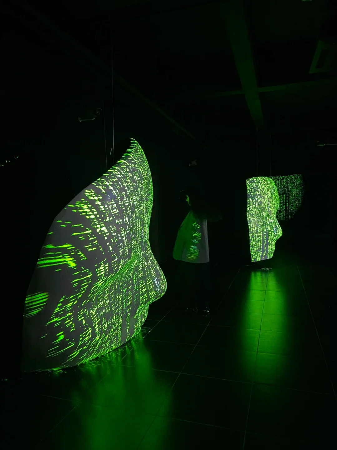 展厅类有一个叫“KTHE THIRD FACE”互动装置(首图和图9),一定要去体验一共有三个类似人脸🎭的装置,一个为现场采集的观众的人脸,第二个为系统对采集的人脸进行随机匹配相应的画面,第三个为符号化的影像。装置主要是探究人在社会化后的多面性,暗示着对本真自我愈发难以确定的状态。📸拍照很出片。