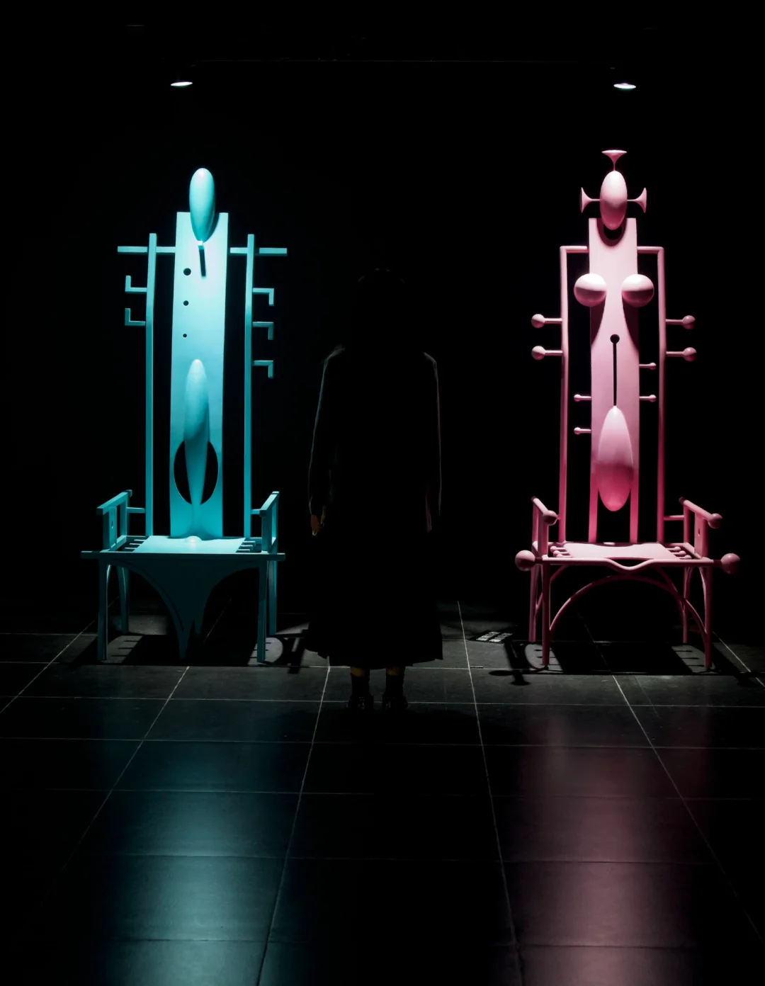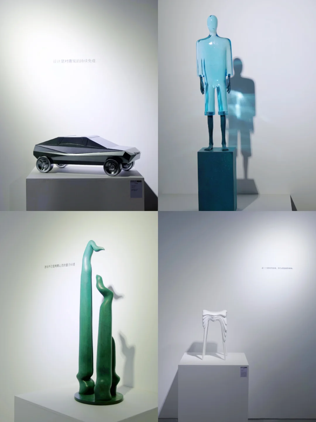 展品中个人比较喜欢许燎原老师设计的几款概念🏎️汽车,统一银白色车身,线条切割分明,设计动感。还有就是刘爱华老师设计的“融化的椅子🪑”,听现场工作人员介绍,这是这个夏天,刘老师在成都极端高温🔥背景下创作出来的作品。介绍词“造一个柔软的板凳,因为屁股瘦骨嶙峋。”也十分有意思。