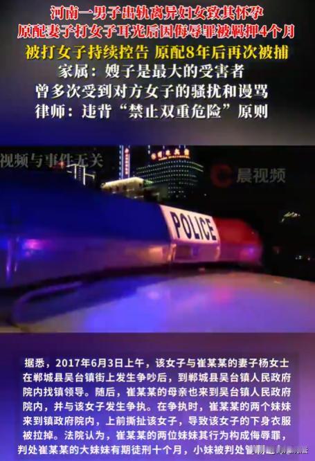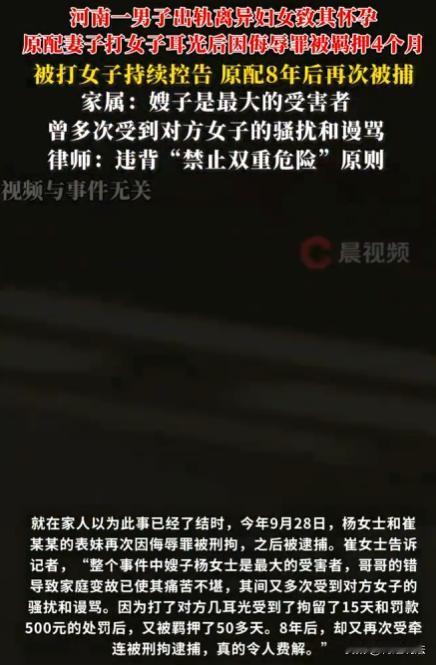 河南,已婚男子与离异女子发展不正当关系,女子怀孕后向男子索要9万赔偿,被原配发现,怒打女子两耳光,被罚款500元、拘留15天,后又因侮辱罪被羁押4个月。但女子仍不解气,持续告状,8年后原配再次因同一事件被捕。 已婚的崔某某,2016年时,跟镇上一离异女子好上了。 崔某某就是图个新鲜,没想负责,家里老婆孩子照旧,结果这女子怀孕了,想让崔某某离婚娶她,崔某某哪肯。 女子可没想放过他,到崔某某的单位大闹,让他名声扫地。 2017年4月,崔某某被这事搅得焦头烂额,他找了个中间人去跟那离异女子调解。最后赔了女子9万块钱,条件是让她去做流产,两人以后彻底断干净,不再有任何瓜葛。 本以为这事就这么过去了,可6月3日上午,女子和崔某某妻子杨某在大街上碰到了。 这场景,就跟仇人见面似的,分外眼红,两人当场就吵了起来。 当时,还引来了不少路人围观。 两人吵着吵着,还把镇上领导也找了来,想让其给评评理。 崔某某的母亲和两个妹妹听说这情况,火急火燎地赶了过来,一家人凑在一起,那情绪一上来,就开始骂那离异女子。 骂着骂着,气氛就不对了,后来直接动了手。 杨某当时也在气头上,上去就打了那女子两耳光,那女子被打后,当场就决定要告杨某和她两个小姑子。 起诉后,两个妹妹因为侮辱罪,一个被判了10个月,另一个被管制2年。杨某先是被罚款500元、拘留15天。 到了10月,又因为强制猥亵、侮辱罪被刑拘,在看守所待了4个多月后,才取保候审出来。 杨某出来后,本以为这事终于能消停了,可女子,一直咽不下被耍的这事。 8年来,她一直不停地告状,到处反映情况,就想着要讨个说法。 杨某在这8年里日子也不好过,就怕那女子又整出什么幺蛾子,家里人也都跟着担惊受怕,生活被搅得一团糟。 2025年10月25日,杨某突然被警方逮捕,理由还是因为当年的侮辱罪。 杨某当时就崩溃了,她怎么也想不明白,这么多年过去了,怎么又因为这事被逮捕。 这事儿一传开,大家都在议论纷纷,各种观点都有。 有人说,杨某一家当时太过分了,当街对那女子进行辱骂和殴打,这种行为就应该受到法律的严惩,现在再次被逮捕也是活该。 可也有人觉得,那离异女子插足别人的婚姻,本身就是不道德的行为。杨某作为原配,一时冲动才做出了那些过激的举动。 而且2017年杨某已经因为这事儿受到了行政处罚,现在过了8年又因为同一件事被追诉,感觉有点不太合理,是不是法律在偏袒那个插足的离异女子,还浪费了司法资源。 女子觉得自己这么多年一直坚持告状,就是为了讨回一个公道,她觉得自己在这段关系里受了太多的委屈,不能就这么算了。 杨某2017年受行政处罚后,2025年又被逮捕追诉,是否违反禁止双重危险原则呢? 根据《刑法》第三条,法律明文规定为犯罪行为的,依照法律定罪处刑。 行政处罚依据的是《行政处罚法》,针对违反行政管理秩序行为,像罚款、拘留等。而刑事处罚针对犯罪行为,二者性质不同。 禁止双重危险原则,这个原则是说一个人不能因为同一犯罪行为,多次受到刑事追诉和处罚。 从本案看,杨某2017年受到的是行政处罚,行政处罚和刑事处罚是不同的。行政处罚是对违反行政管理法规行为的制裁,刑事处罚是对犯罪行为的制裁。 杨某2017年的行为虽然受到了行政处罚,但如果后续发现其行为构成犯罪,还是可以追究刑事责任的,这并不违反禁止双重危险原则。 杨某当街撕扯女子衣物、打耳光公开羞辱,这符合《刑法》第二百四十六条规定的侮辱罪的范畴。该条款指出,以暴力或者其他方法公然侮辱他人,情节严重的,处三年以下有期徒刑、拘役、管制或者剥夺政治权利。 法律并没有规定因为道德问题就可以用暴力手段解决,小三插足是道德问题,原配应该通过合法途径维护自己的权益,而不是用暴力。 长期追诉如果没有新的不法事实,8年后因为同一行为再追责,只要符合犯罪构成要件,有充分的证据证明,就是有法律依据的。 法律可不会因为对方是“小三”有道德问题,就允许用暴力手段解决,维权必须合法。 遇到问题,不能靠暴力解决,要依法维权,小三插足是不道德的行为,但我们不能用违法的手段去报复,要用合理合法的方式处理问题。