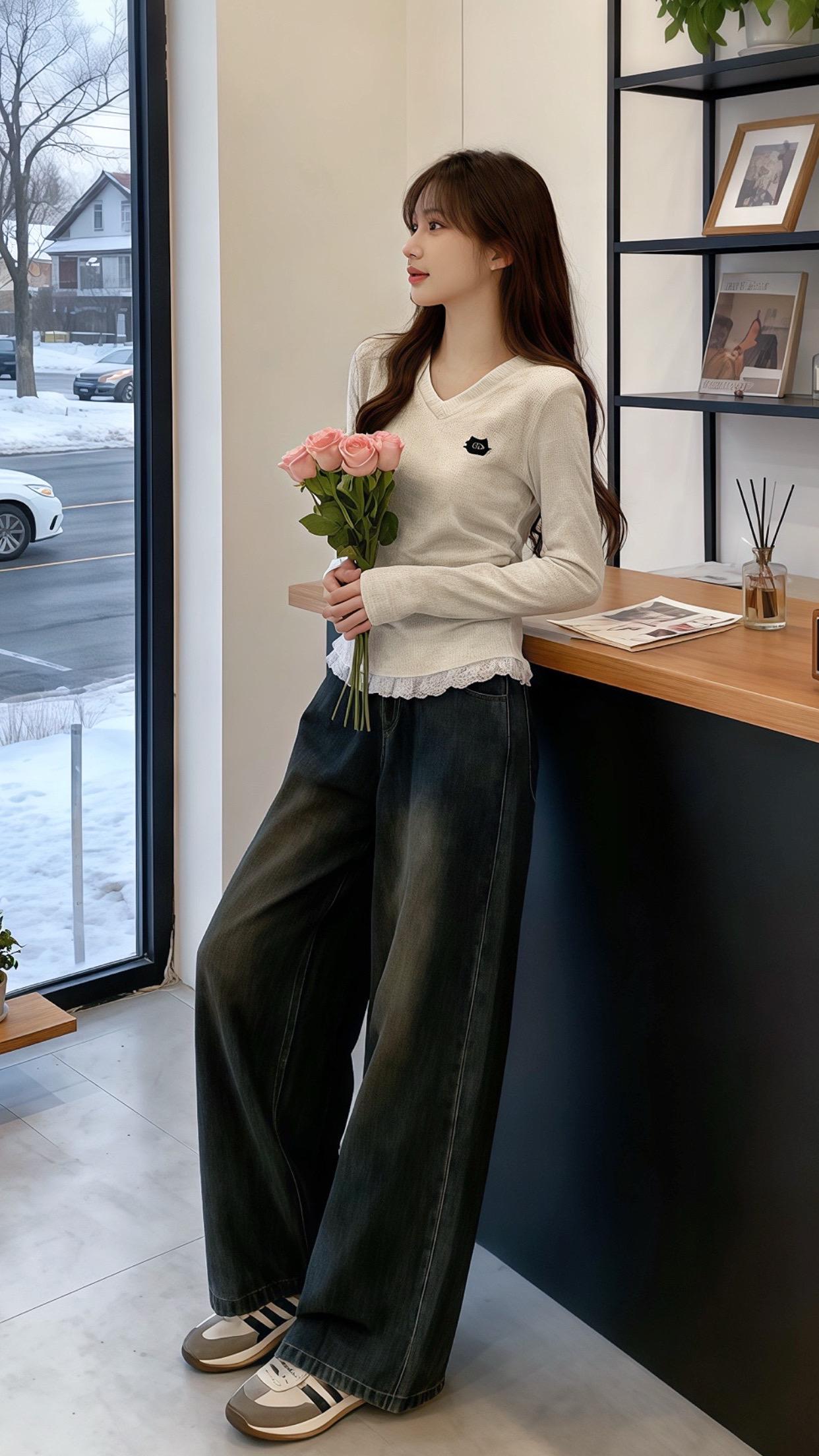 想要轻松随性的日常街头穿搭灵感?这就来分享。像藏青上衣配破洞阔腿裤,就是慵懒松